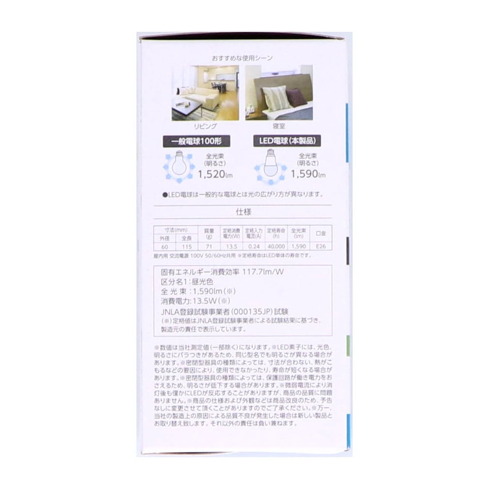 <仕様> 固有エネルギー消費効率:117.7lm/W 区分名1:昼光色 全光束:1,590lm 消費電力:13.5W 定格入力電流:0.24A 定格寿命:40、000時間 口金:E26 省エネ法2027年度目標基準達成 <ご注意> 以下の器具には使用できません。 ・調光機能のついた電球機器や回路 [調光:電球の明るさを変える機能](100%点灯も使用不可) ・リモコンのついた電球機器や回路 ・誘導灯・非常用照明機器 ・水銀灯・ナトリウムランプ・メタルハライドランプなどのHIDランプ機器 ・断熱材施工器具[SB、SGI、SG形表示器具] ・人感センサー・明るさセンサー付などの自動点灯器具