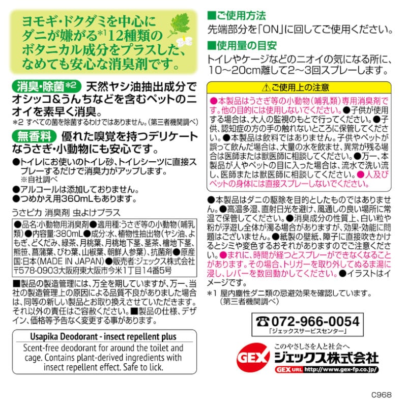 お取り扱い上の注意:●本製品はうさぎ等の小動物(哺乳類)専用消臭剤です。他の目的には使用しないでください。●子供が使用する場合は、大人の監視のもとで行ってください。●子供、認知症の方の手の触れないところに保管してください。●本製品は飲料ではありません。子供やペットが誤って飲んだ場合は、大量の水を飲ませ、異常が残る場合は医師または獣医師に相談してください。●万一、本製品が人やペットの目に入った場合は、流水で洗い流し、医師または獣医師に相談してください。●人及びペットの身体には直接スプレーしないでください。●紙製の壁紙、障子に直接吹きかけるとシミや変色するおそれがありますのでご注意ください。●本製品はダニの駆除を目的としたものではありません。●すべての菌を除菌するわけではありません。(第三者機関調べ)