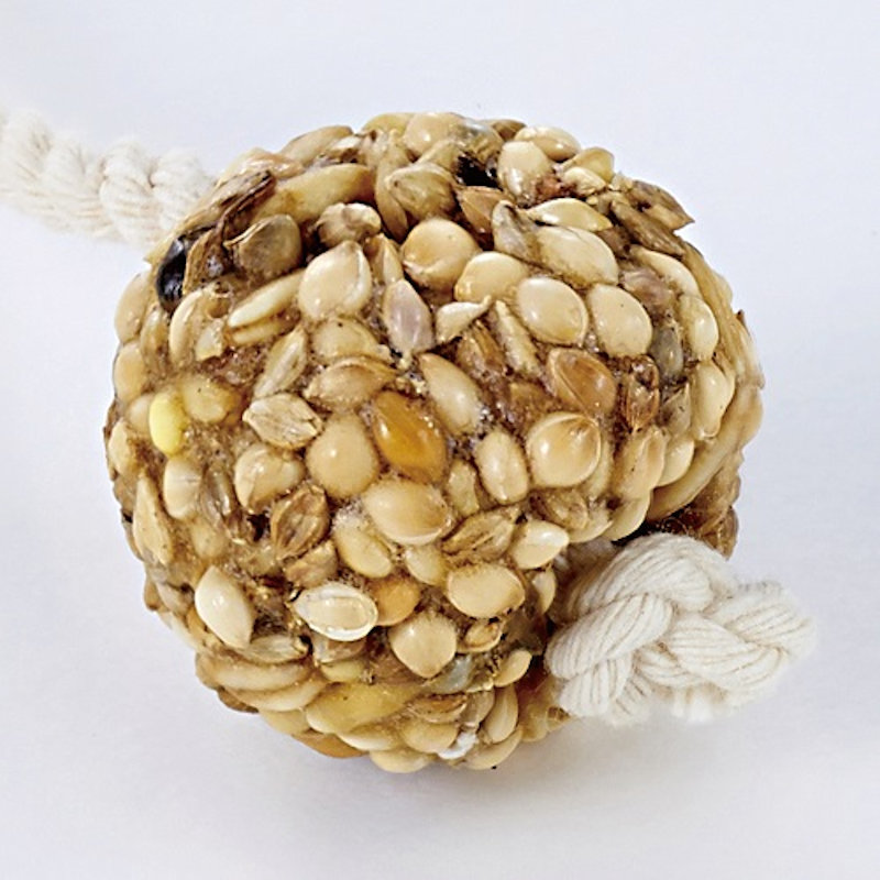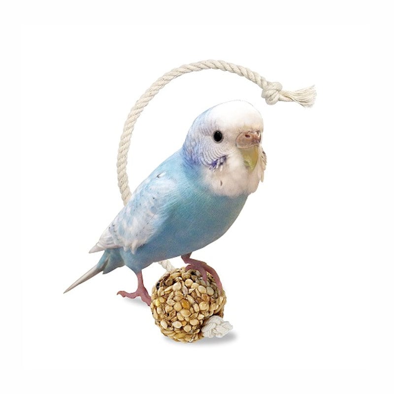 インコの玩具 穀類をボール状にして、インコが転がして遊べるようにした、通してあるひもを使って鳥かごのフェンスなどに固定することもできる。穀類でできているので食べることができる。