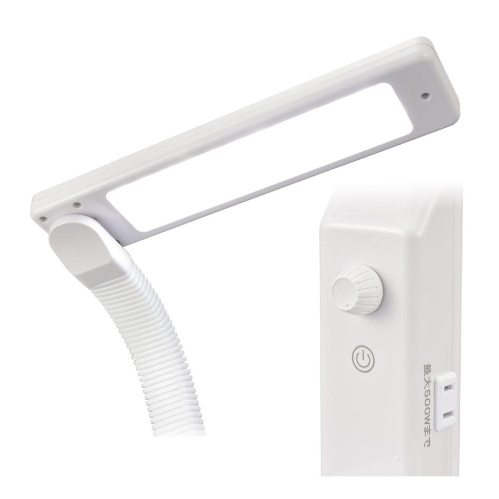 ・ON/OFFタッチ式スイッチ ・サービスコンセント(最大500Wまで)付き ・優しい明りで学習や読書に ・まぶしさ・照射面の反射を軽減 ・ちらつかないLED <仕様> ■定格:AC100V 50/60Hz ■使用光源:チップ型LED使用(交換不可) ■光源色:昼光色 ■平均演色評価数:Ra93 ■照度:約2000ルクス(直下40cmの高さで100%点灯時) ■全光束:約900 lm(100%点灯時) ■消費電力:約10.5W ■エネルギー消費効率:約85.7 lm/W ■スイッチ:ON/OFFスイッチ ■調光:無段階調光(10%~100%) ■電源コード長:約1.8m ■使用場所:屋内用 ■本体寸法:セード長…33cm、アーム長…46cm、台座…22×16cm ■本体質量:約1.75kg ■付属品:保証書付取扱説明書・取り付けネジ