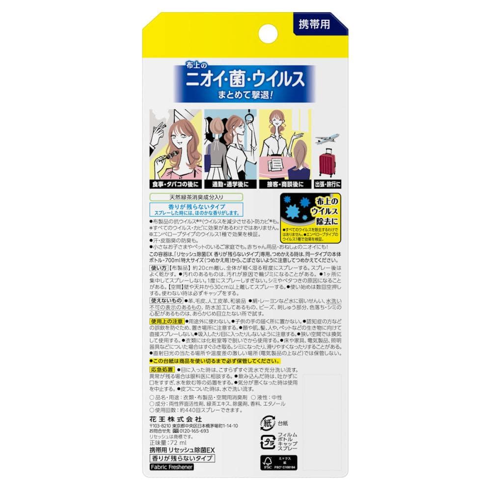 ◆外出先でも布上のニオイ・菌・ウイルスをまとめて撃退!携帯に便利なサイズ。菌・ウイルス※を99%除去*。 *すべての菌・ウイルスを除去するわけではありません。布上での効果。 ※エンベロープタイプのウイルス1種で効果を検証 ◆先回り消臭で汗・皮脂臭を24時間ニオわせません。(中和消臭技術+皮脂酸化ブロック技術) ◆布製品の防カビ効果もあります。(すべてのカビを防ぐわけではありません) ◆香りが残らないタイプ