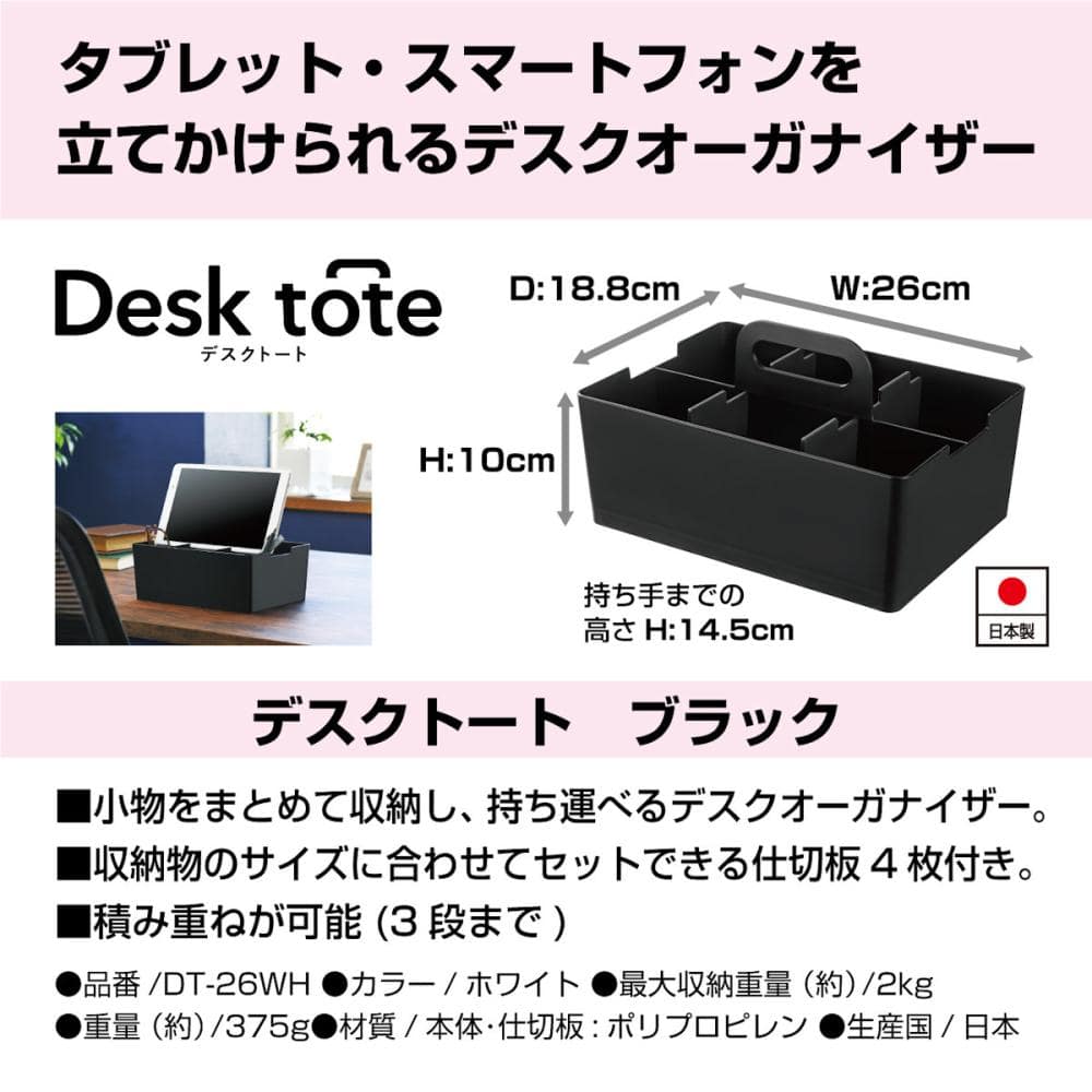 小物をまとめて収納し、持ち運べるデスクオーガナイザー。 タブレットやスマートフォンを立てかけられるので、テレワークなどに便利。 (仕切板の向きを変えることで立てかけるものの角度が2段階調整可能) 収納物のサイズに合わせてセットが出来る仕切板4枚付き。 積み重ねが可能(3段まで)
