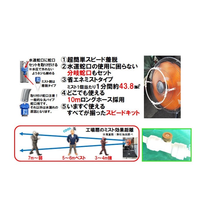 ●超簡単スピード着脱 ●水道蛇口の使用に困らない分岐蛇口もセット ●省エネミスト ●10mロングホース採用 ●ミスト3個