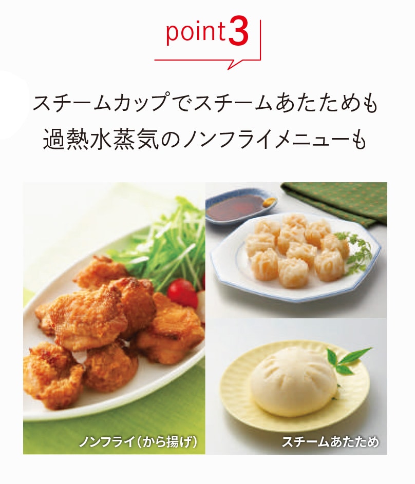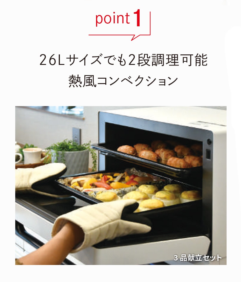 ・加熱方式:スチーム+ヒーター加熱(スチームカップ式) ・オーブン温度:110~250℃ 発酵温度 30/35/40/45℃ ・レンジ出力:1000W・600W・500W・200W相当 ・掲載メニュー数(自動メニュー数):113(95) ・庫内有効寸法:幅388×奥行304×高さ216mm ・電源:AC 100V(50Hz-60Hz共用) ・定格消費電力 レンジ:1420W オーブン/グリル:1380/1380W
