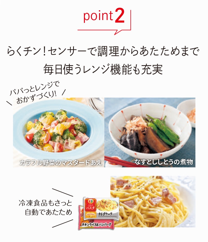 ・らくチン!センサー(絶対湿度センサー)でレンジ調理・あたため機能も充実お好みの食材&分量でおかず作りらくチン1品 ・見やすい大型ホワイトバックライト液晶