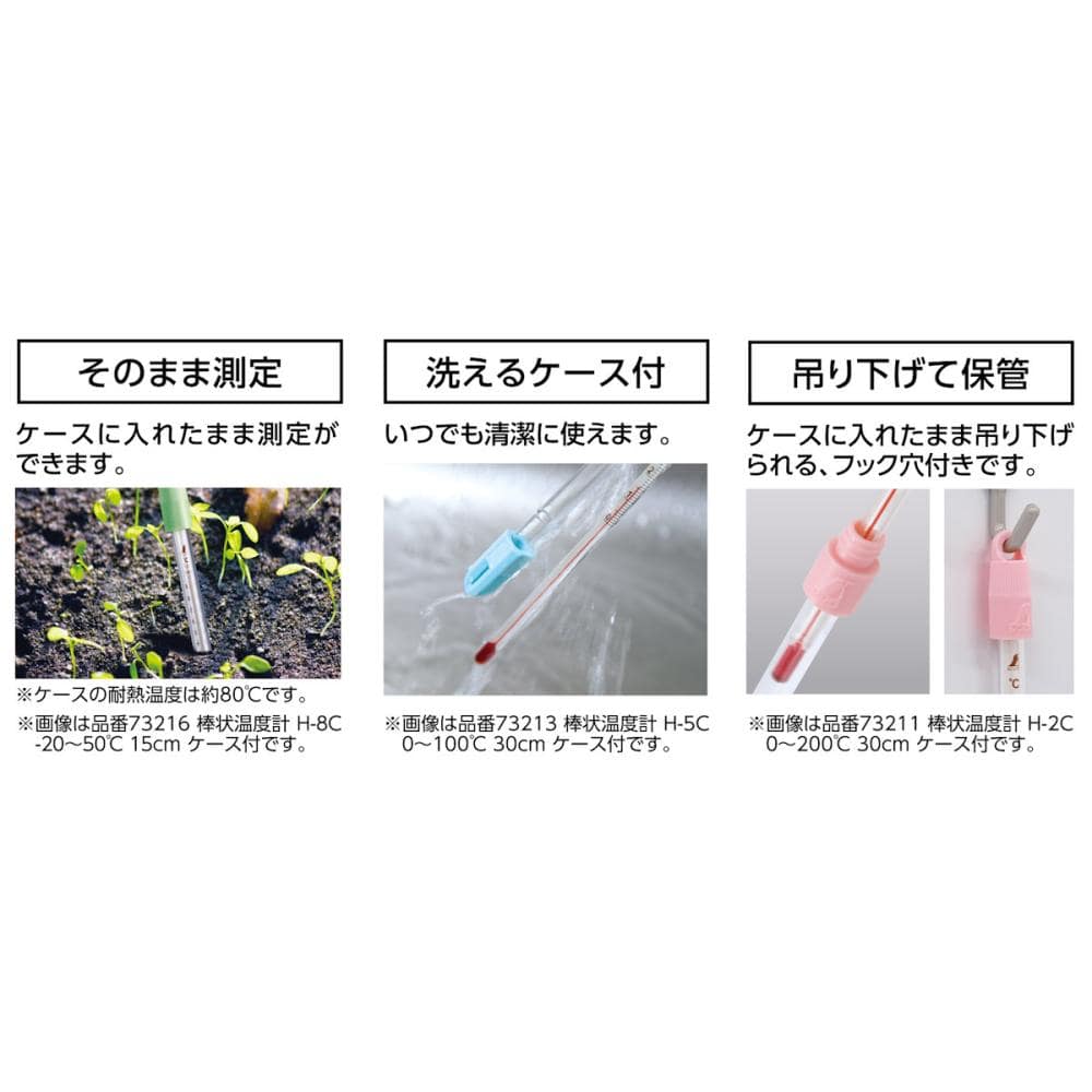 【仕様】 ■測定範囲 -20~105℃ ■精度 ±1℃ ■1目盛 1℃ 【材質】 ■本体:ガラス ■感温液:着色精製白灯油 ■ケース:ポリプロピレン樹脂、ポリスチレン樹脂、ポリカーボネート樹脂