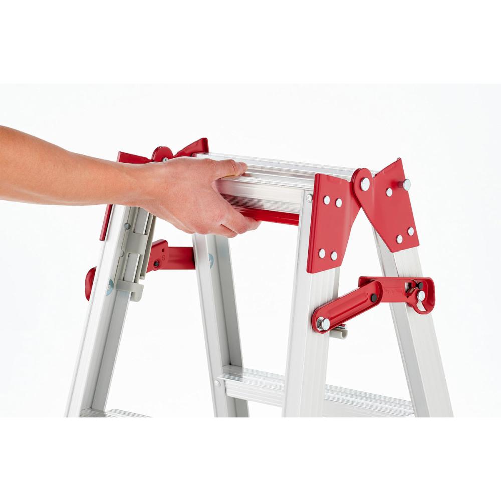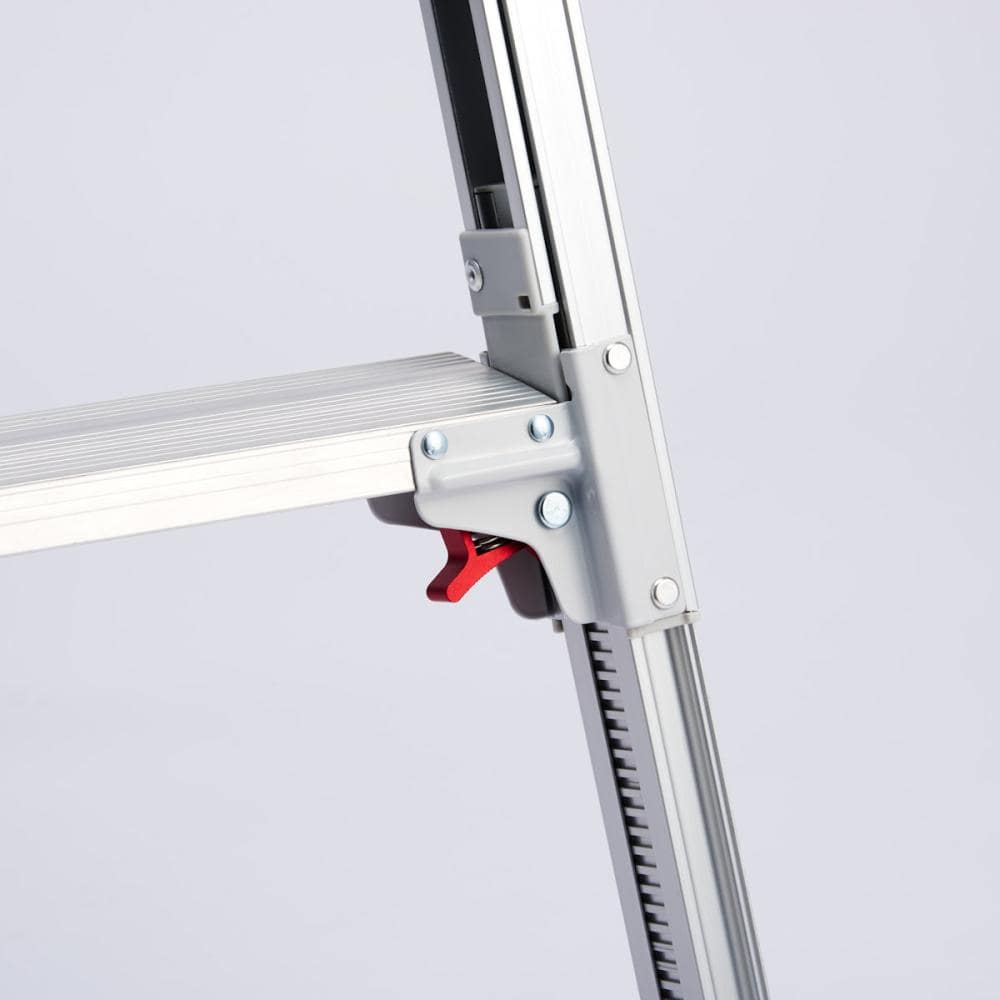 ワンタッチバーで簡単開き止め解除 ステップ幅広伸縮構造で安心作業 天板トレー形状で工具を置ける便利設計
