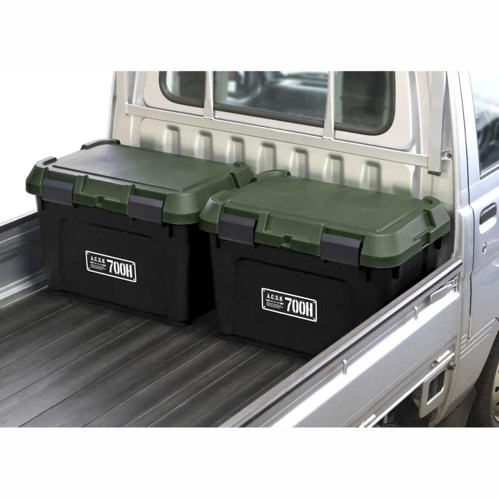 工具・大工道具、アウトドア・キャンプ用品、園芸用品などがたっぷり収納可能な大型で頑丈な収納ボックスです。 幅700mmで軽トラックの荷台に2個ピッタリ並びます。