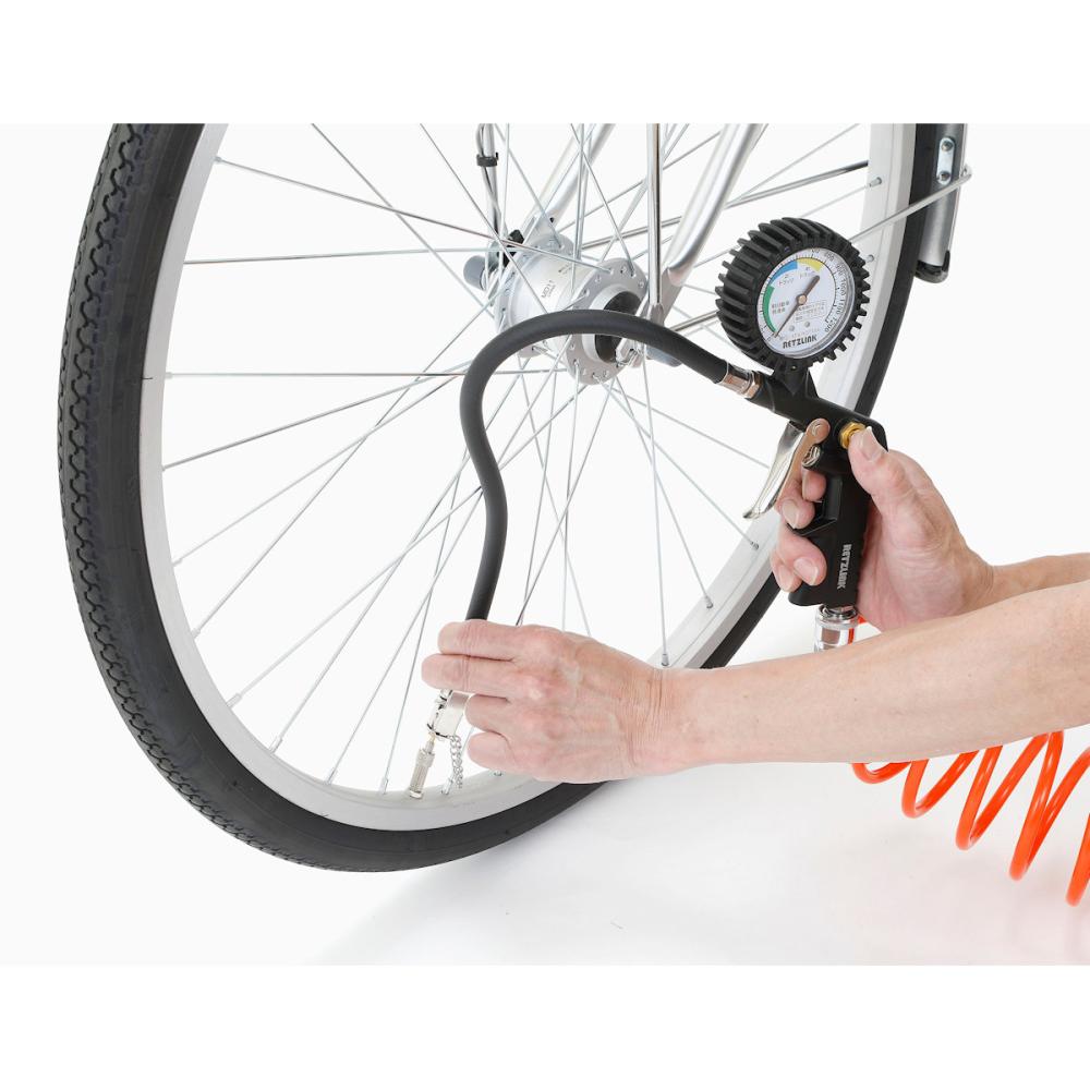 エアーコンプレッサーと接続して、自動車やバイク、自転車のタイヤの空気圧チェックと空気入れ、ゴミやほこりの吹き飛ばし等に使用します。