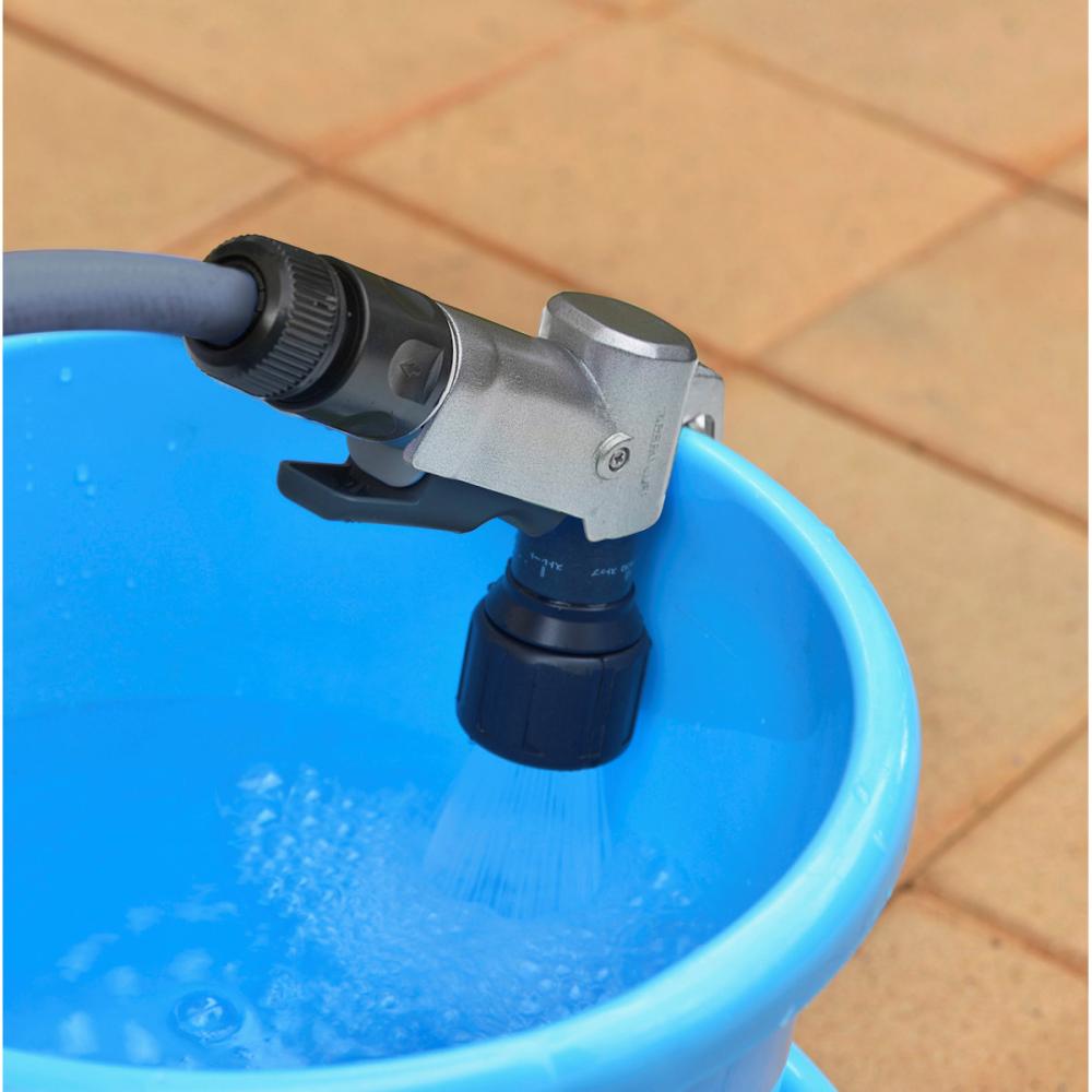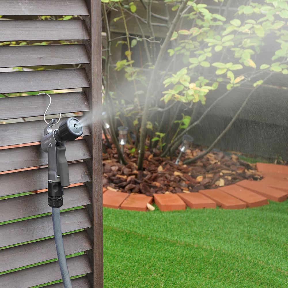 本体は丈夫なメタル製で耐久性抜群です。 内部の水の膨張を防ぐ凍結防止機能付きで冬の凍結割れに強いです。 ミスト機能で夏の納涼に活躍します。 女性でも持ちやすいコンパクト設計で、握りやすいグリップ形状です。 ひっかけ機能付きでバケツへの水溜めに便利です。 フック部にはS字フックなどを通せる穴があり、ラティスやフェンスに掛けてご使用できます。 水形はミスト、カクサン、ストレート、ストップ、ジョウロ、シャワーの6種類で用途に合わせてお選びいただけます。