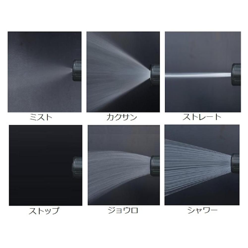 材質/本体:ABS,亜鉛 ヘッドゴム:EPDM 適合ホースサイズ/内径12~15mm 外径20mmまで 耐水圧/0.7ⅯP未満 水形/ミスト、カクサン、ストレート、ストップ、ジョウロ、シャワー(6種類)