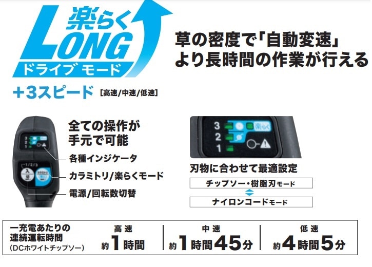 ・Uハンドル(左右非対称)仕様。 ・先端に配置、アウタロータBLモータ 外側のロータが回転するので、極めて高トルク。 定回転制御で負荷がかかっても回転数が落ちにくい。 ギヤを使用せず、ロータで刃物を直接回転、ダイレクトドライブ。 高速回転6,500min⁻¹。 ・雨の中でも運転可能※ 雨の中でも運転可能な防水設計、防滴・防じん「ウェットガード」&防水保護等級「IPX4」により実現。 ※本製品は(充電器除く)、雨の中での使用等に耐えうる製品仕様と なっていますが、故障しないことを保証するものではありません ・楽らくロングドライブモード+3スピード(高速・中速・低速)草の密度で「自動変速」。 より長時間の作業が行える。 ・全ての操作が手元で可能 ボタンを押すだけで簡単始動。 ・刃物に合わせて最適な回転速度の設定が可能 「チップソー・樹脂刃」と「ナイロンコード」に最適な回転数を設定。 ・キックバック時に刃物がストップ「AFT」搭載。逆回転カラミトリ機能付。 ・1充電あたりの作業面積 [目安] 実作業面積約72坪(237平方メートル)。 [バッテリBL4040、楽らくロングドライブモード、DCホワイトチップソー使用時/草丈約30cm]