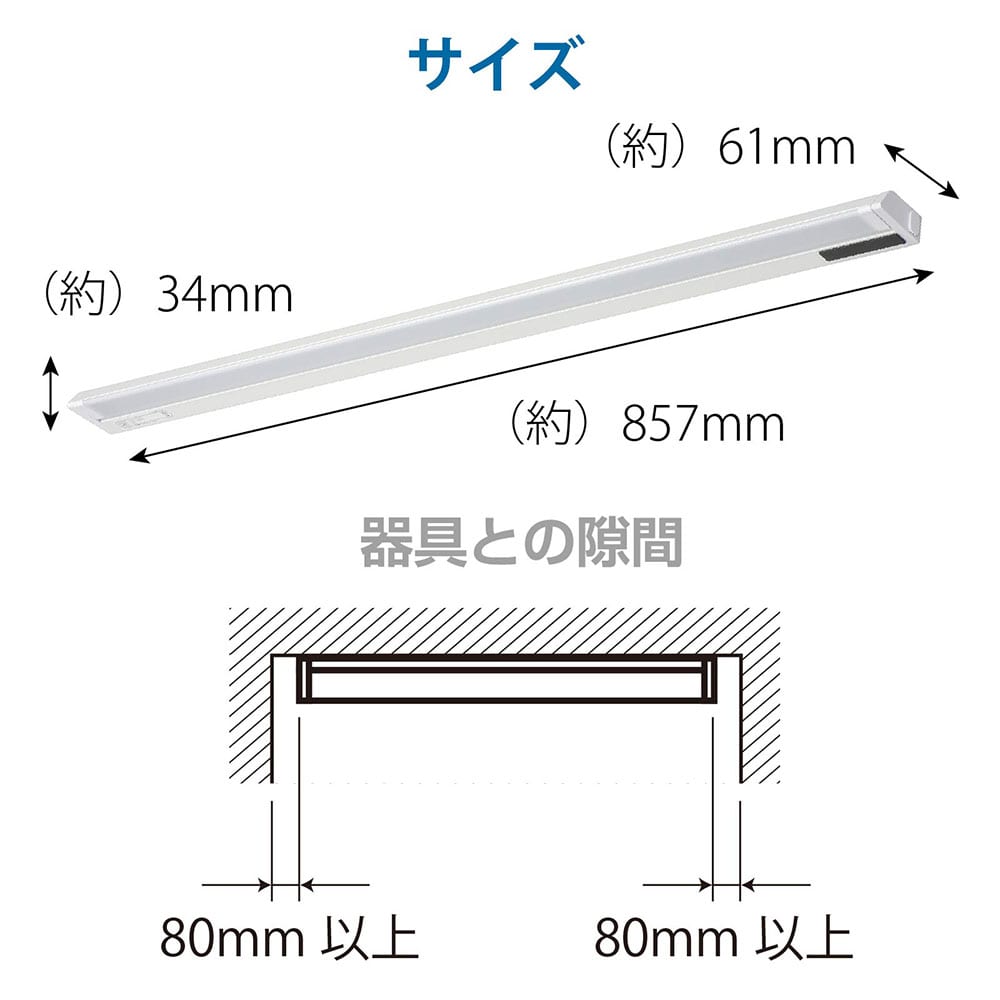 ■ 定格電圧:AC100V 50/60Hz ■ 定格消費電力:14.0W(待機時…0.5W以下) ■ 光源色:昼光色 ■ 全光束:1300 lm ■ 固有エネルギー消費効率:92.8 lm/W ■ 平均演色評価数:Ra80 ■ 使用場所:屋内(屋外使用禁止) ■ 外形寸法:(約)幅857×高さ34×奥行61mm(本体のみ) ■ 本体質量:約506g ■ 取付ピッチ:755mm ■ 付属品:固定用ネジ×2本、電源コード約1.4m×1本、固定用両面テープ×9枚、サイドキャップ※本体に装着済み、保証書付取扱説明書、リモコン×1 個、リチウムコイン電池(CR2025/リモコンに内蔵)×1 個 ≪ご注意≫ ※ リモコンタイプの本体は2台目以降に連結しないでください。連結する場合、必ずリモコンタイプを1台目に取付けてください。 ※ 連結する場合、リモコン操作で一度にON/OFFが可能です。また、電源のON/OFFはそれぞれの本体のスイッチでも行えます。 【 別売品 】 ≪専用オプショナルパーツ≫ LEDイーブライトスリム専用連結コード(約30cm)(型番:LT-NLEESP-01/品番:06-4093) LEDイーブライトスリム専用連結コード(約100cm)(型番:LT-NLEESP-02/品番:06-4094) LEDイーブライトスリム/LEDエコスリム専用マグネット(型番:LT-NLEESP-03/品番:06-4095) LEDイーブライトスリム/LEDエコスリム専用スイッチ付電源コード(約150cm)(型番:LT-NLEESP-04/品番:06-4096) ≪連結用≫ 連結用LEDイーブライトスリム多目的灯 昼光色 5.0W/302mm(型番:LT-NLES05D-HL/品番:06-4035) 連結用LEDイーブライトスリム多目的灯 昼光色 10.0W/558mm(型番:LT-NLES10D-HL/品番:06-4036) 連結用LEDイーブライトスリム多目的灯 昼光色 14.0W/857mm(型番:LT-NLES14D-HL/品番:06-4037)