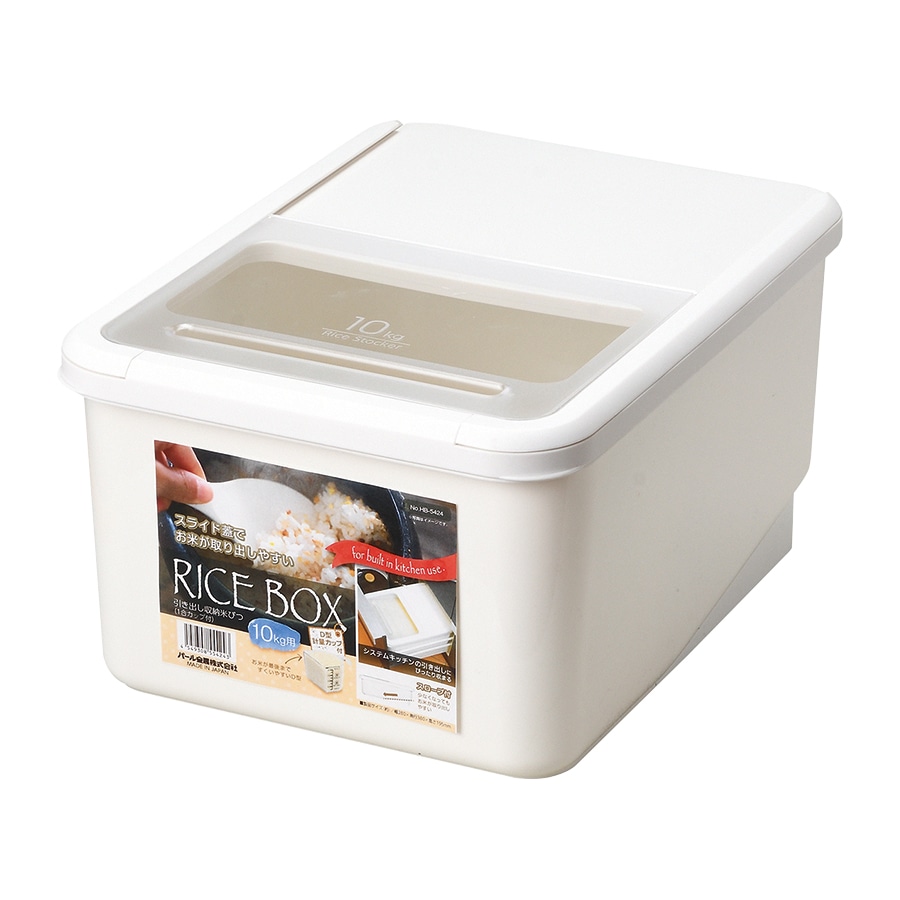 ■システムキッチンの引き出しにぴったり収まります。 ■透明のスライド蓋で、中が見やすく残量がわかりやすい。 ■中はお米が少なくなっても取り出しやすい、スロープ仕様です。 ■お米が最後まですくいやすいD型軽量カップ(1合)付き。