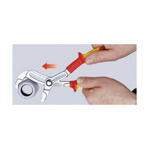 ●ヘッド仕上げ:クロムメッキ●ハンドル仕様:1000V絶縁(VDE絶縁テスト済み)●つかみ面:横すじ入り●パイプ容量(径inch):2●ナット開口範囲(mm):46●パイプ開口範囲(径mm):50●調節段数:24●全長(mm):250●質量(g):397●掴み面には特殊焼き入れされた歯がつけられています。●歯の硬度は約 61 HRCで、耐摩耗性が高ので、確実な掴みが長期間続きます。●材質はオイル焼き入れ焼き戻し処理済みのクロームバナジウム電気鋼。●鍛造により大変頑丈です。●DIN EN/IEC60900基準に適合。●二種類の素材から成る1000V絶縁ハンドルは赤と黄のツートンカラーを採用することで、非絶縁ツールとの差別化を図っています。●ワークに直接押し当てて設定、素早く、確実に、楽に操作できます。●ワークに触れずに、ボタンプッシュで開きます。●様々な大きさの工作物に最適に適合させるための精密調整と握りやすいハンドルポジション。●ヘッドとジョイント部分のスリムな構造により、ワークへのアクセスにとくに優れています。●パイプやナットにセルフロックするので、ワークから滑り落ちることがなく、力を入れずに作業できます。●ボックスジョイント構造のダブルガイドにより非常に安定しています。●挟み込み防止により、指が挟まれるのを防ぎます。●滑り落ち防止を取り付けるための一体型絶縁固定留め輪付き。