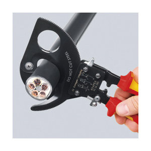 ●ヘッド仕上げ:ラッカー仕上げ(黒)●ハンドル仕様:1000V絶縁(VDE絶縁テスト済み)●切断能力(銅線(多芯);径mm):32●切断能力(銅線(多芯);mm2):240●切断能力( MCM):500●全長(mm):250●質量(g):652●替刃品番:9539-250●鍛造により大変頑丈です。●材質はオイル焼き入れ焼き戻し処理済みの高級特殊工具鋼。●DIN EN/IEC60900基準に適合。●二種類の素材から成る1000V絶縁ハンドルは赤と黄のツートンカラーを採用することで、非絶縁ツールとの差別化を図っています。●銅およびアルミの単線、複合線を切断することができます。●ブレードは精密に研磨され、焼き入れ処理が施されています。●ケーブルを変形させず、綺麗に切断することができます。●ラチェット機構により片手での操作が可能です。●てこの原理を最大限利用するデザインにより、少ない力で高い切断能力を発揮します。●2段階ラチェット機構により簡単にケーブルを切断できます。●軽量コンパクトなデザインで扱いやすく、狭い場所でも使用できます。●ハンドルはつば付きで、しっかり握ることができます。●挟み込み防止により、指が挟まれるのを防ぎます。●オープンスプリング付き。※スチール製ワイヤーおよびワイヤーロープには適しません。