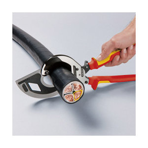 ●ヘッド仕上げ:黒防錆コート●ハンドル仕様:1000V絶縁(VDE絶縁テスト済み)●切断能力(銅線(多芯);径mm):60●切断能力(銅線(多芯);mm2):600●切断能力( MCM):1200●全長(mm):320●質量(g):830●交換部品:9539-320-01(スイング刃リペアセット)、9539-320-02(固定刃リペアセット)●鍛造により大変頑丈です。●材質は材質はオイル焼き入れ焼き戻し処理済みの高級特殊工具鋼。●DIN EN/IEC60900基準に適合。●二種類の素材から成る1000V絶縁ハンドルは赤と黄のツートンカラーを採用することで、非絶縁ツールとの差別化を図っています。●革新的なリングギヤドライブ。●軽量(825g)なコンパクト構造(長さ320mm)により取り扱いが簡単です。●狭い場所でも使用できます。●銅、アルミの単線、複合線を直径60mmまで切断することができます。●ブレードは精密に研磨され、焼き入れ処理が施されています。●ケーブルを変形させず、綺麗に切断することができます。●てこの原理を最大限利用するデザインにより、少ない力で高い切断能力を発揮します。●1アクション3ギア送りの『3段ドライブ』採用で片手または両手で簡単に切断できます。●3ギア送りはより力を多く加えたい際に最適です。●切断する際に、プライヤーを置くエリアのある固定式ハンドル。●最大径60mmのケーブル用。※スチール製ワイヤーおよびワイヤーロープには適しません。