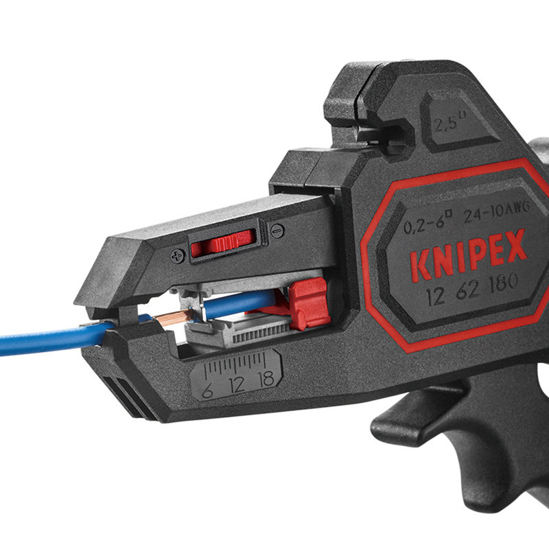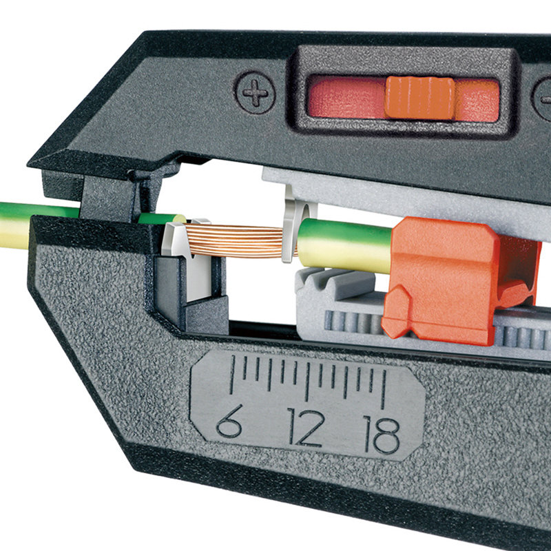●ボディー材質:グラスファイバー強化プラスチック●刃材質:特殊工具鋼、油焼き入れ●ストリッピング能力(mm2):0.2-6.0●ストリッピング能力(AWG):24-10●全長(mm):180●質量(g):151●交換部品:替刃(1269-21)、調整ストッパー(1269-23)●一般的な0.2~6mm2までの単線、複合線、より線に対応します。●芯線を傷つけることなく被覆の厚さに合わせて自動的に切り込み深さを調整します。●様々な導体断面に自動的に適合するので、芯線を痛めません。●軽量ボディーと握りやすいハンドル形状により快適に作業できます。●スリムなヘッド形状により、狭い場所での作業に最適です。●2.5mm2までの銅及びアルミ線を切断できるワイヤーカッター装備。●6.0~18mmまでの範囲で調整可能な長さ調整ストッパーを装備しており、繰り返しの作業も快適に行えます。●ボディーは強化プラスチック製、ハンドル上部はしっかり握ることができるようにソフトな素材を採用しています。●一般的なケーブルのストリッピング(皮むき)に最適。