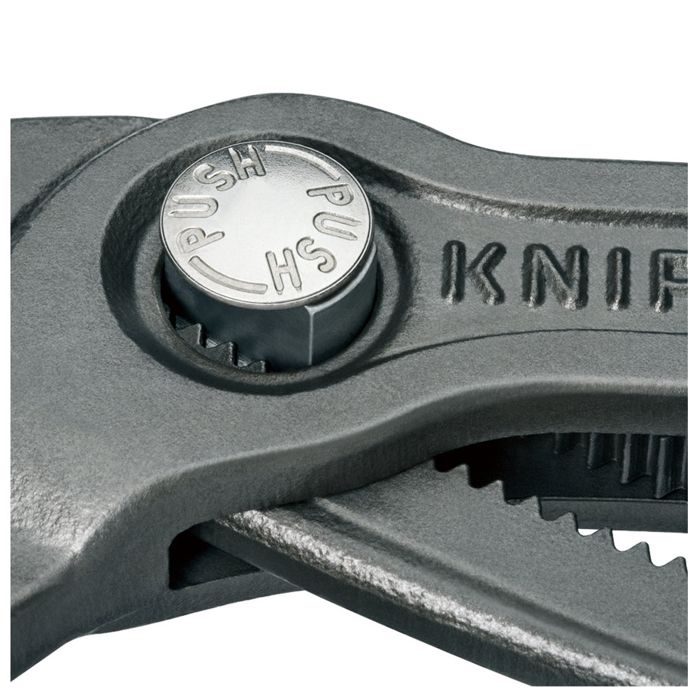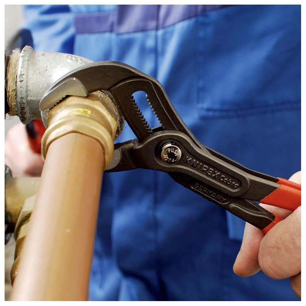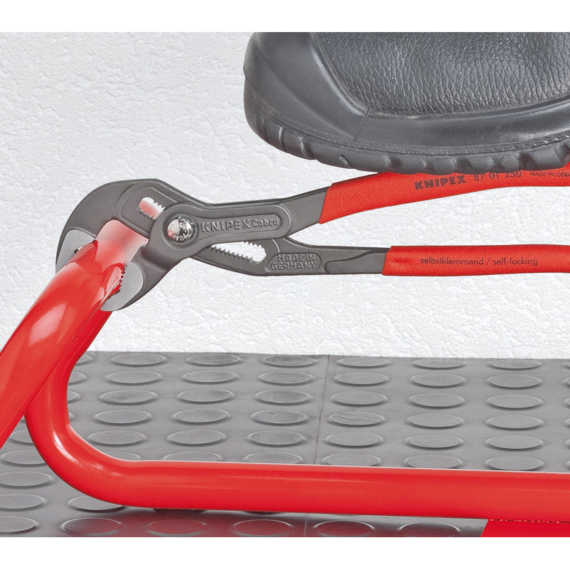 ●ヘッド仕上げ:クロムメッキ●ハンドル仕様:プラスチックコーティング(滑り防止仕上げ)●つかみ面:横すじ入り●調整段数:25●パイプつかみ能力(径mm):50●ナットつかみ能力(mm):46●全長(mm):250●質量(g):314●KNIPEXの“コブラ”は高性能なウォーターポンププライヤーです。●ジョイント部は横方向へのブレを防止する3枚合わせ(ボックスジョイント)。●プッシュボタンにより、素早く簡単にアゴの幅を細かく調整できます。●アゴの開き調整はプッシュボタンにて行うため、作業中は不意に口幅が変わらないので早く快適に作業ができます。●アゴの開きは片手で調節が可能です。●上のアゴを対象物にあて、プッシュボタンを押しながら、下アゴを上にスライドさせるだけで簡単に調整することができます。●口幅を最大に調節して握っても、ハンドルの間にクリアランスを確保する指詰めストッパー付き。●少ない力でパイプやナットを確実につかむ平行四辺形のアゴ形状。●てこの原理を最大限発揮するデザインで高いグリップ力を発揮します。●入念な焼入れ処理が施されたつかみ面の硬度は約HRC61で、耐磨耗性が高く、確実なグリップを発揮します。●材質はオイル焼き入れ焼き戻し処理済みのクロームバナジウム電気鋼。
