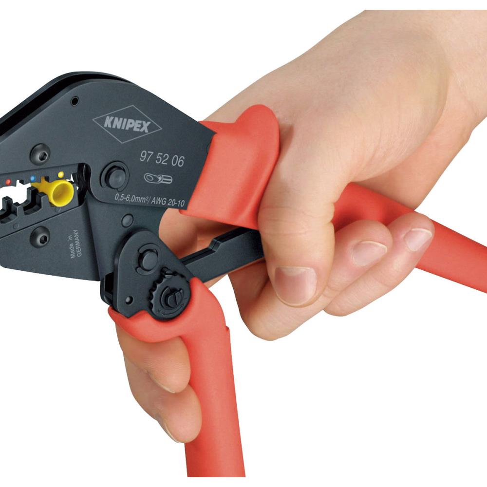 ●ヘッド仕上げ:磨き、黒表面処理●ハンドル仕様:プラスチックスリーブ(滑り防止加工済)●全長(mm):250●クリンピング能力(mm2):0.5-6.0●クリンピング能力(AWG):20-10●圧着段数:3●質量(g):565●適用:絶縁端子●てこの原理を最大限利用する新型デザインにより、従来の圧着プライヤーより30%少ない力で圧着することが可能。●精密な圧着ダイスと強制ロック(解除可能)により安定した圧着作業ができます。●両手操作で、断面の大きい導体を簡単に圧着できます。●直径が太い場合の圧着は両手で簡単に作業できる。●最適な重心位置とアングルのついたヘッド、人間工学に基づいたハンドル形状により大変作業しやすい。●負荷のかかる全パーツはオイル焼き入れ焼き戻し処理済みの高級クロムバナジウム電気鋼。●圧着する接続端子に上下のジョーが当たるまで、2本の指でハンドルを近づけます。●手全体を使って、その先の圧着工程を行います。●絶縁された接続端子が6.00mm2の場合など、比較的大きな力が必要な際には、ハンドルが長いので両手操作も可能です。●ハンダ付けを必要としない端子等の圧着作業に。●絶縁端子用。※アゴの交換は出来ません。交換式のものを希望の場合、9743タイプをご購入ください。