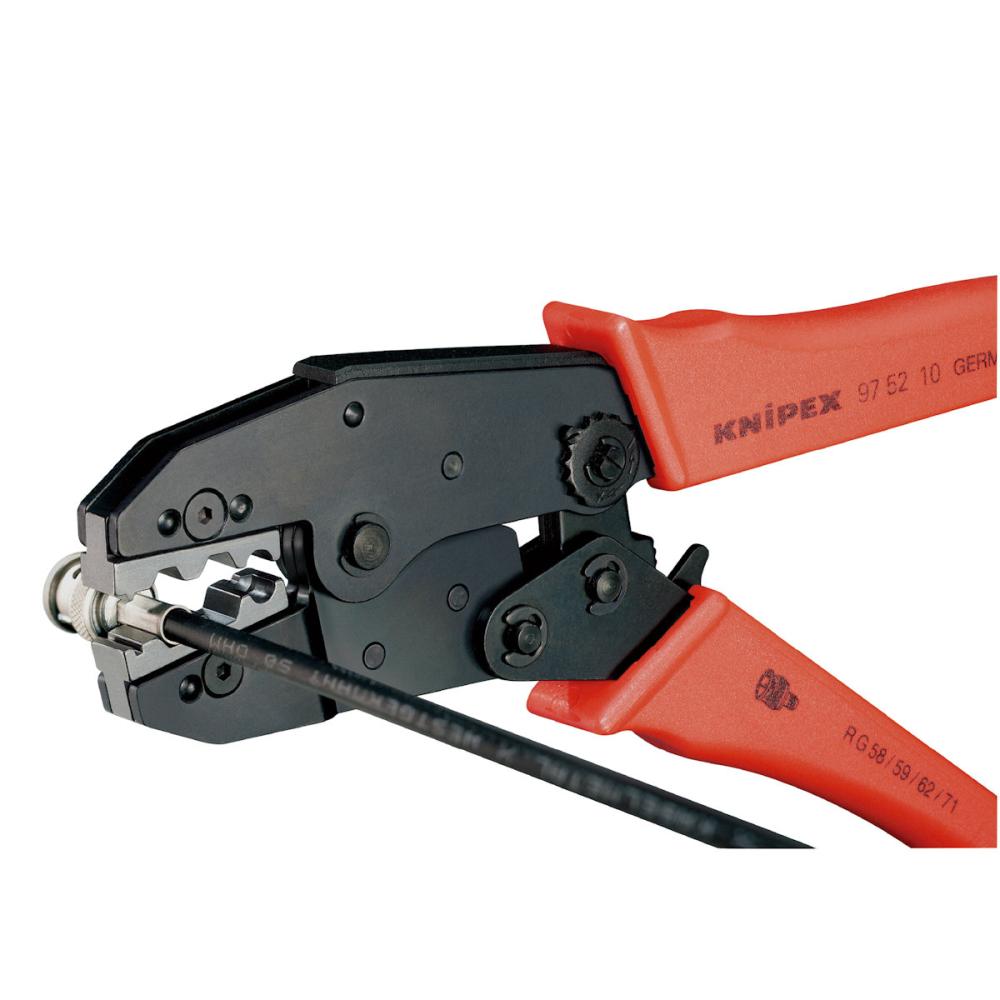 ●ヘッド仕上げ:磨き、黒表面処理●ハンドル仕様:プラスチックスリーブ(滑り防止加工済)●圧着段数:3●全長(mm):250●質量(g):577●適合ケーブル:RG58/59/62/71/223●てこの原理を最大限利用する新型デザインにより、従来の圧着プライヤーより30%少ない力で圧着することが可能。●精密な圧着ダイスと強制ロック(解除可能)により安定した圧着作業ができます。●両手操作で、断面の大きい導体を簡単に圧着できます。●直径が太い場合の圧着は両手で簡単に作業できる。●最適な重心位置とアングルのついたヘッド、人間工学に基づいたハンドル形状により大変作業しやすい。●負荷のかかる全パーツはオイル焼き入れ焼き戻し処理済みの高級クロムバナジウム電気鋼。●圧着する接続端子に上下のジョーが当たるまで、2本の指でハンドルを近づけます。●手全体を使って、その先の圧着工程を行います。●絶縁された接続端子が6.00mm2の場合など、比較的大きな力が必要な際には、ハンドルが長いので両手操作も可能です。●ハンダ付けを必要としない端子等の圧着作業に。●Coax、BNC、TNCコネクター(RG58、59、62、71)用。※アゴの交換は出来ません。交換式のものを希望の場合、9743タイプをご購入ください。