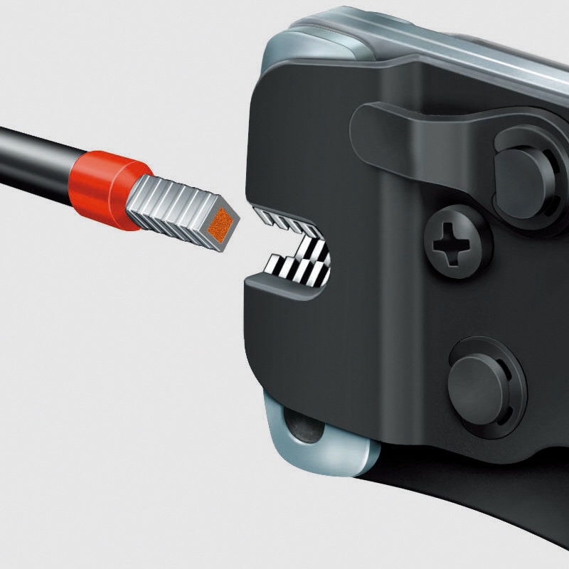 ●ヘッド仕上げ:磨き、黒表面処理●ハンドル仕様:コンフォート●全長(mm):190●クリンピング能力(mm2):0.08-10+16●クリンピング能力(AWG):28-5●圧着段数:1●質量(g):486●適用:4角クリンプ●希望するエンドスリーブのサイズに自動的に調整するので間違ったダイの使用による圧着ミスがありません。●エンドスリーブをツール正面から差し込み圧着します。●強制ロック(解除可能)により安定した圧着作業が可能です。●工場にて規格に適合するように精密に設定されています。●トグルレバーによって力を増幅し、作業の疲労を少なくします。●軽量なハンディータイプで簡単に圧着作業が行えます。●負荷のかかる全パーツはオイル焼き入れ焼き戻し処理済みの高級クロムバナジウム電気鋼。●四角形状にて圧着します。●1つのダイスで0.08~10.0mm2および16.0mm2を圧着します。●圧着範囲0.08~10または16.0mm2の調整用セレクタレバー付き。●最大2×6mm2または2×AWG8のすべてのツインエンドスリーブにとくに合います。●ハンドルは複数の材質で作られたプラスチックカバー付き。●DIN46228第1項および第4項に準じるエンドスリーブの圧着に。●ハンダ付けを必要としない端子等の圧着作業に。●エンドスリーブ用。●フェルール用。※コンフォートハンドル(本品)は絶縁ではありません。