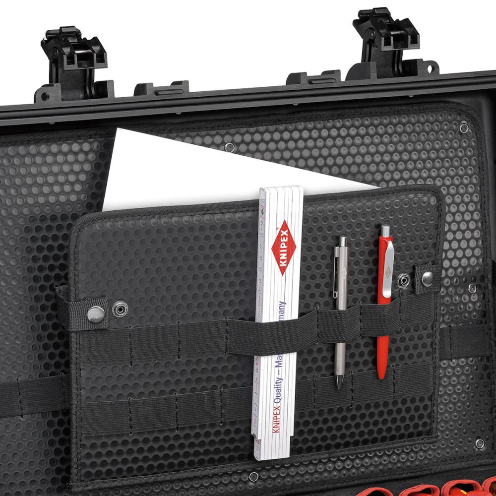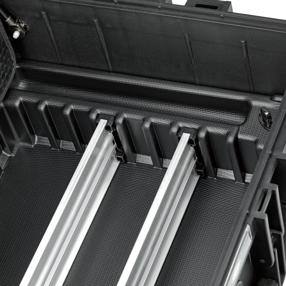 ●外寸(mm):幅609×高さ263×奥行428●内寸(mm):幅540×高さ229×奥行364●耐荷重(kg):35●耐熱温度(℃):-30~80●容量(L):45●質量(g):10800●耐衝撃性のあるポリプロピレン製のケースです。●防塵、密閉、防水、空気孔バルブ付。●ツールパネルには54のツールポケットと94のツールループがついています。●ロック可能なボトムトレイは、アルミニウム仕切りシステムで個別に分割可能。●エルゴノミーに配慮した2コンポーネントハンドル。●滑りのよいローラー(X2)、伸縮ハンドル付き。●付属品:南京錠