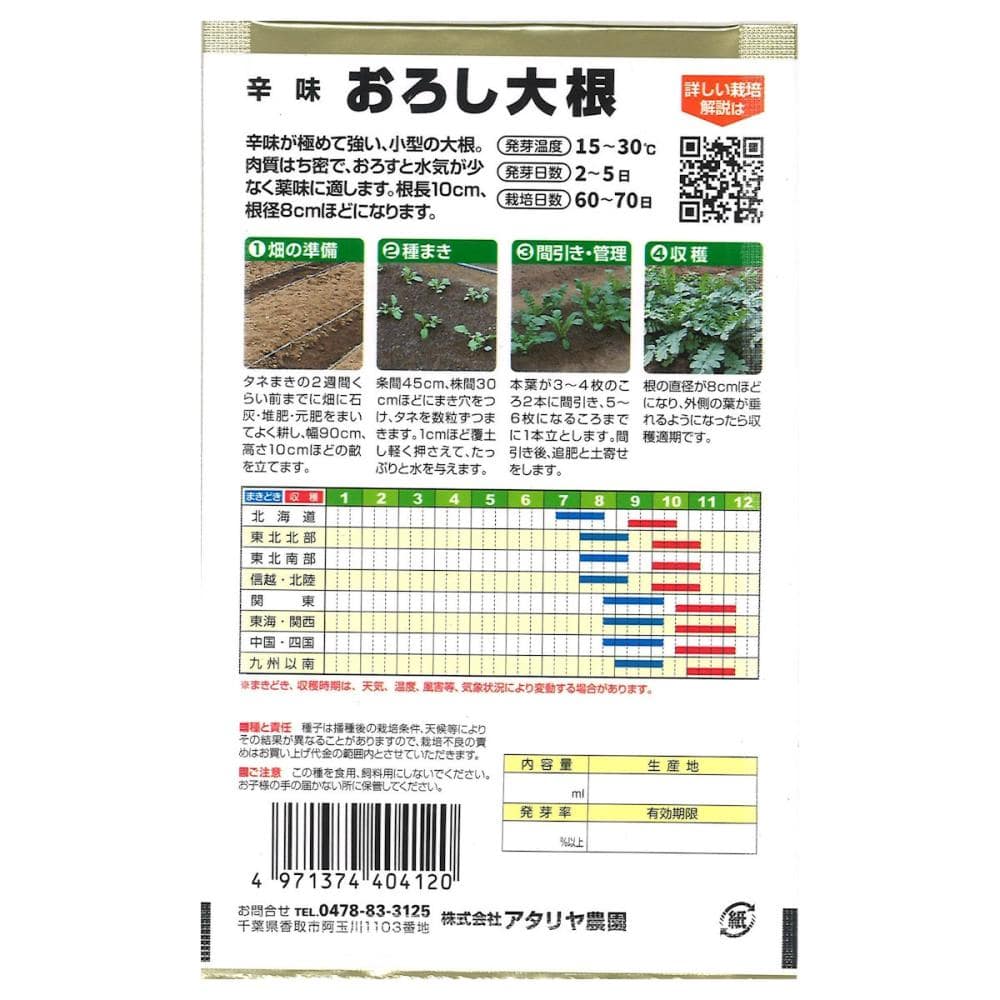 辛みが極めて強い、小型の大根。肉質はち密で、おろすと水気が少なく薬味に適します。根長10cm、根径8cmほどになります。