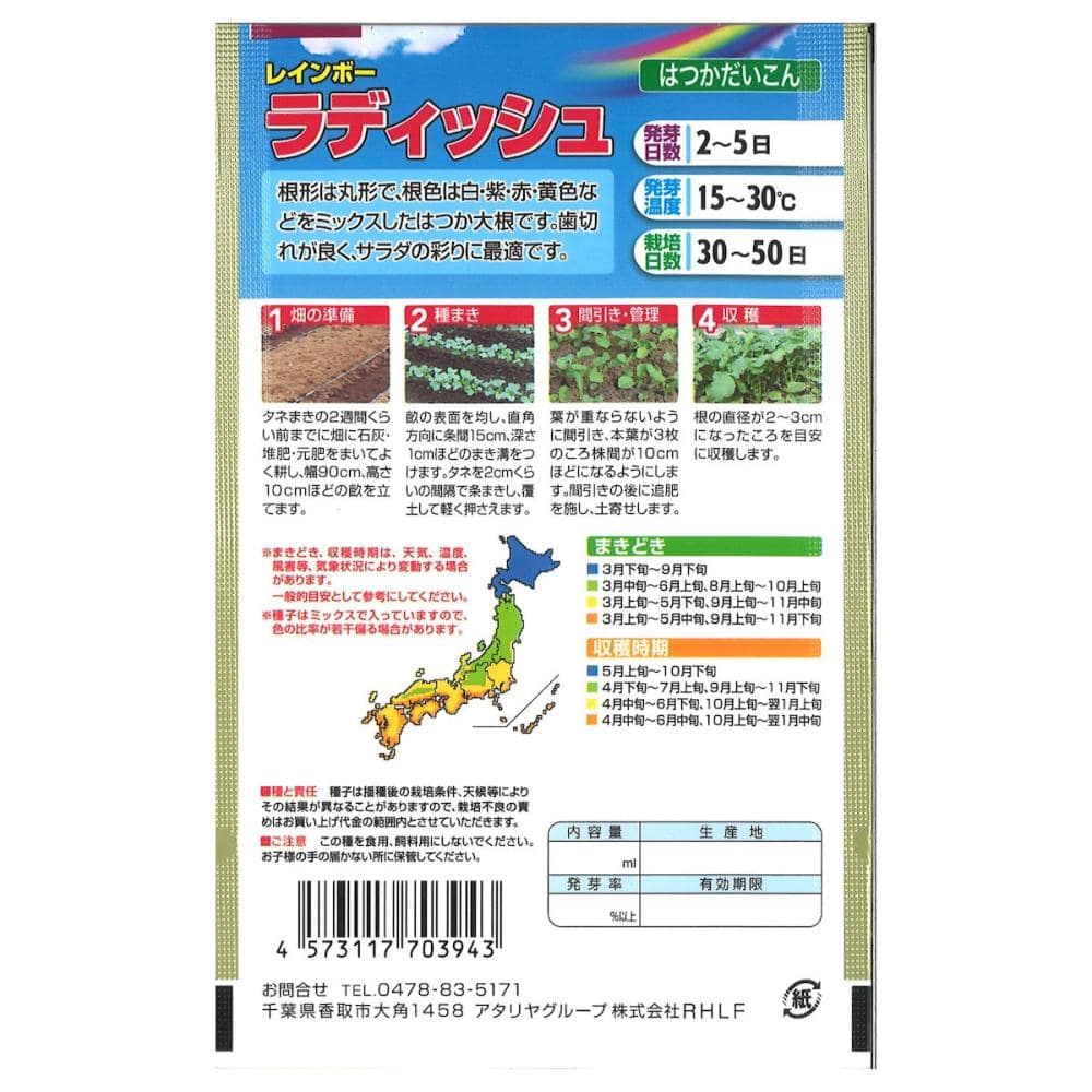 根形は丸形で、根色は白・紫・赤・黄色などをミックスしたはつか大根です。歯切れが良く、サラダの彩りに最適です。