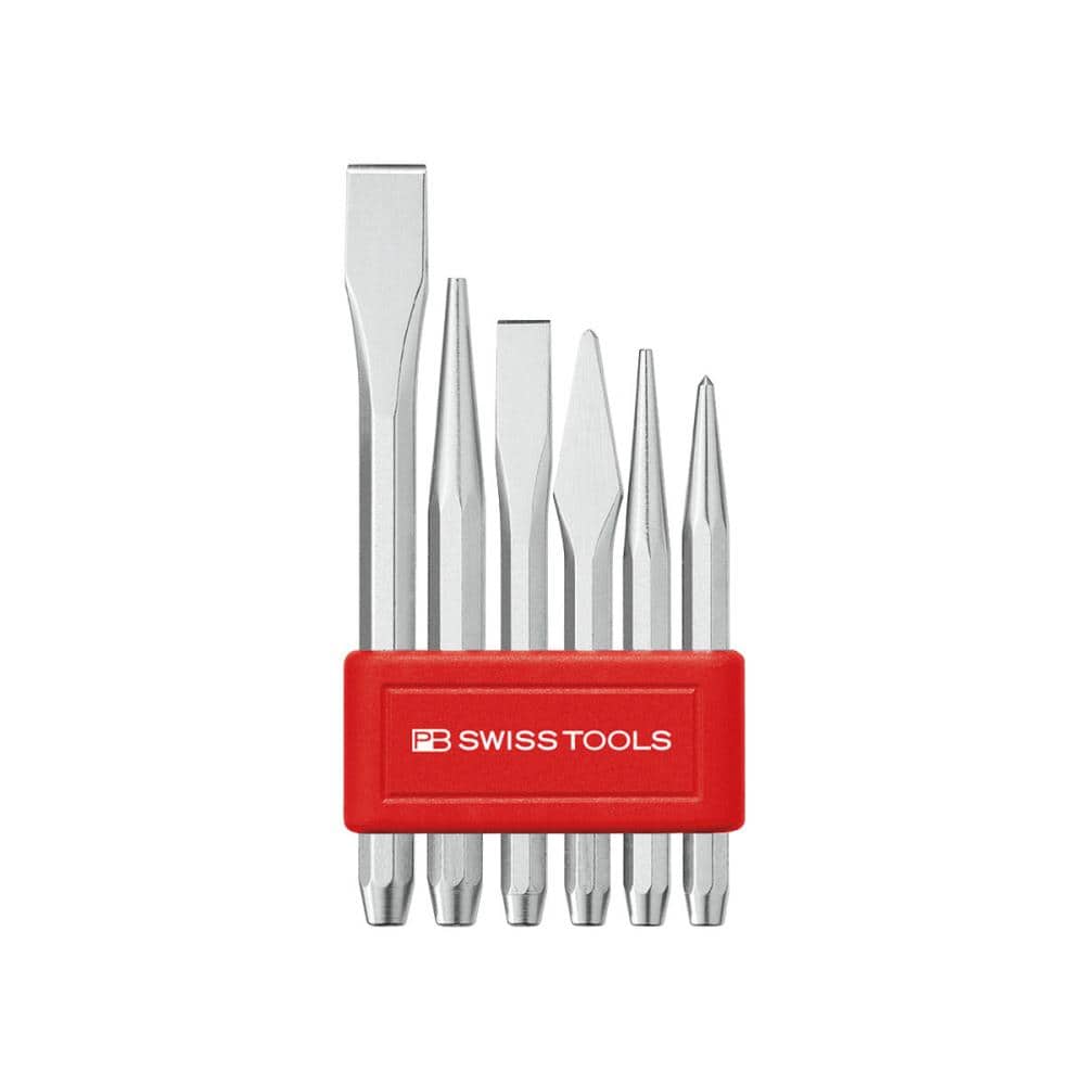 ●材質:特殊バネ鋼●質量(g):545●PB独自の特殊鋼により刃先は非常に頑丈で耐破損性が高く、使用によるチッピングが生じません。●PBのタガネは全体に焼き入れ焼き戻し処理をしています。●打撃ヘッドは、ISO、DIN規格に沿って電気誘導焼き入れ処理が施され、安全性が高められています。●ボディーはクロームメッキ加工されており、握りやすく、見た目にも美しい仕上げとなっています。●ホルダー付き。●パッケージなし。●セット内容:センターポンチ(710-2)、テーパーピンポンチ(730-3、4)、フラットタガネ(805-12、18)、エボシタガネ(815-5)