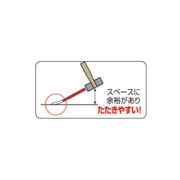 ●材質:クロムバナジウム鋼●刃先幅(mm):26●全長(mm):235●胴サイズ(mm):26x7●刃長(mm):30(側面)●質量(g):260●独自の特殊鋼により刃先は非常に頑丈で耐破損性が高く、使用によるチッピングが生じません。●PBのタガネは全体に焼き入れ焼き戻し処理をしています。●打撃ヘッドは、ISO、DIN規格に沿って電気誘導焼き入れ処理が施され、安全性が高められています。●ボディーはパウダーコーティングされており、握りやすく、表面を保護しています。●先端が曲がって(反って)いる形状ですので、すきまにアクセスし易く、またスペースに余裕があるのでたたきやすく、作業性抜群です。●刃先の再研磨が可能で経済的。