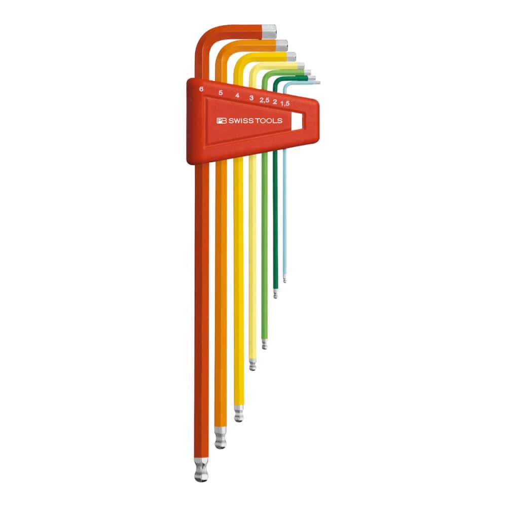 ●質量(g):133●PBレインボーレンチはそれぞれのカラーにより使用寸法を一目で判別できるようにしました。●特殊パウダーコートにより、耐錆性があります。●エッジは軽く隅取りしてあり、レンチをたやすくネジ穴に差し込むことができます。●レンチには5桁の生産番号が記されており、この番号で原料段階の製造過程まで遡ることができます。●硬度はHRC59と大変高く、しかも強靭に作られているので、耐摩擦性、持久性に優れ、高トルクをかけることができます。●精密に作られたボールポイントで角度のついたところのネジを回すことが可能です。(斜め30°の角度までOK)●ホルダー付き。●環境保護を考えたパッケージレス仕様です。●セット内容:ボール付ロング六角棒レンチ(1.5、2、2.5、3、4、5、6mm)※ボール部では本締めできません。