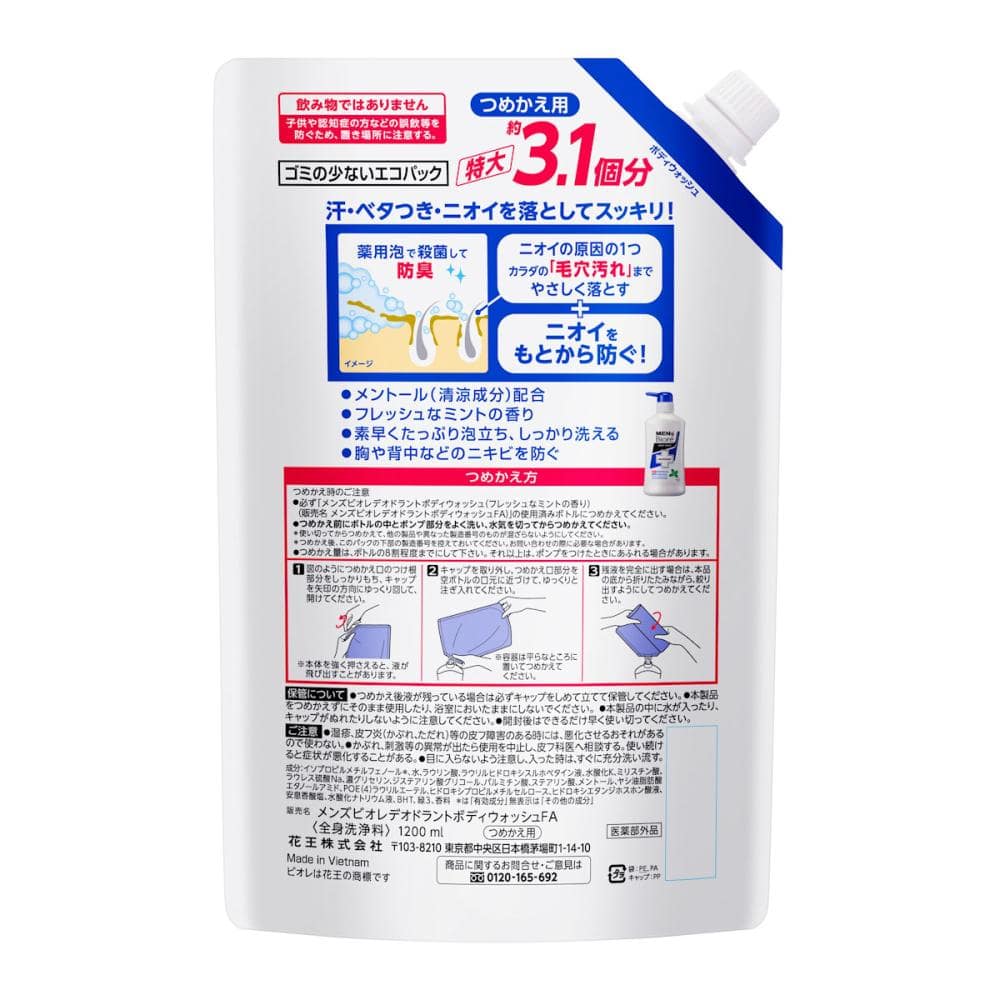 使用上の注意:つめかえ時のご注意 ●必ず「メンズビオレデオドラントボディウォッシュ(フレッシュなミントの香り)(販売名 メンズビオレデオドラントボディウォッシュFA)」の使用済みボトルにつめかえてください。 ●つめかえ前にボトルの中とポンプ部分をよく洗い、水気を切ってからつめかえてください。 *使い切ってからつめかえて、他の製品や異なった製造番号のものが混ざらないようにしてください。 *つめかえ後、このパックの下部の製造番号を控えておいてください。お問い合わせの際に必要な場合があります。 ●つめかえ量は、ボトルの8割程度までにして下さい。それ以上は、ポンプをつけたときにあふれる場合があります。 ご注意 ●湿疹、皮フ炎(かぶれ、ただれ)等の皮フ障害のある時には、悪化させるおそれがあるので使わない。 ●かぶれ、刺激等の異常が出たら使用を中止し、皮フ科医へ相談する。使い続けると症状が悪化することがある。 ●目に入らないよう注意し、入った時は、すぐに充分洗い流す。