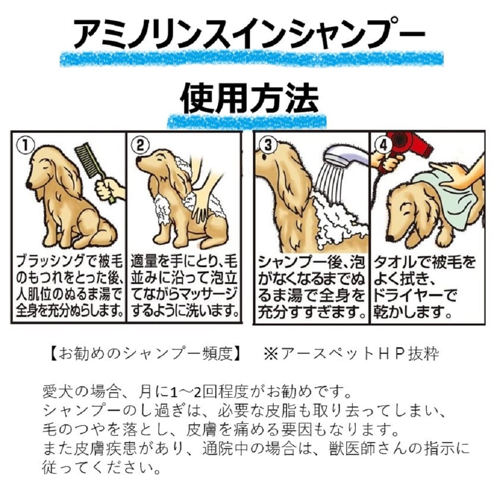 商品の利用(調理)方法:1.シャンプー前によくブラッシングし、被毛のもつれをほぐします。 2.ぬるま湯でよくぬらした後、適量を愛犬の体にかけて、毛並にそってマッサージするように泡立てて洗います。 3.シャンプー後は、ぬるま湯で十分すすぎ、よく水分を拭き取って乾かします。