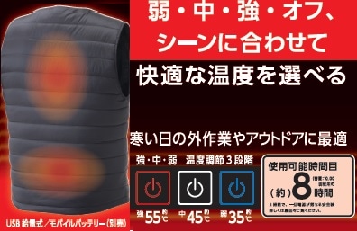 "●スイッチが裾にあるから目立たず、扱いやすい。 ●高温・中温・低温の3段階から温度調節が可能。 高温(約55℃)・中温(約45℃)・低温(約35℃)の3段階で温度調節が可能なため、肌寒い屋外・暖房のきいた室内など、冬特有の温度変化に柔軟に対応します。 ●低温やけど防止の二重安全機能付き 低温やけど防止として、連続約2時間使用で自動的に電源が切れます。 また、強・中の設定の場合、約1時間で自動的に弱に切り替わり、 さらに約1時間後に自動的に電源が切れる二重安全機能付き。 いつでも安心してご使用いただけます"