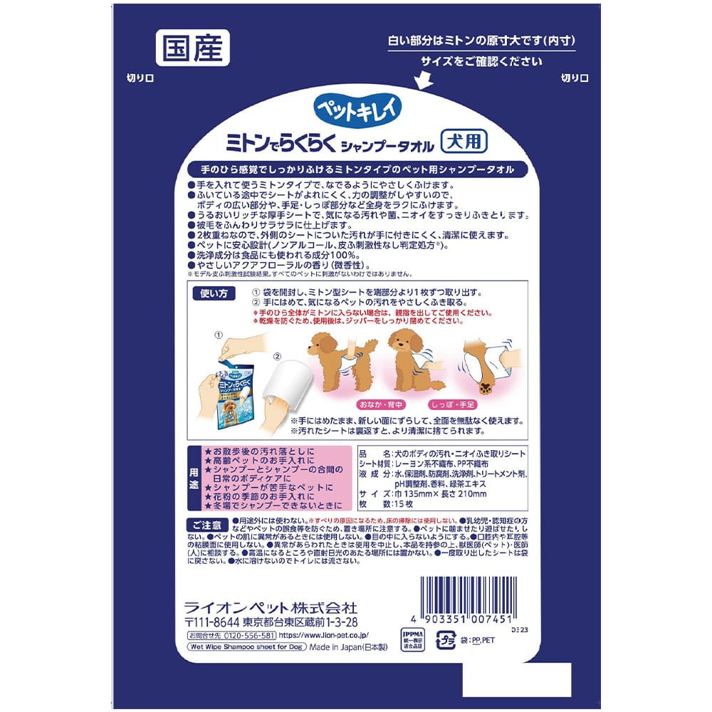 お取り扱い上の注意:●用途外には使わない。※すべりの原因になるため、床の掃除には使用しない。●乳幼児・認知症の方などやペットの誤食等を防ぐため、置き場所に注意する。●ペットに噛ませたり遊ばせたりしない。●ペットの肌に異常があるときには使用しない。●目の中に入らないようにする。●口腔内や耳腔等の粘膜面に使用しない。●異常があらわれたときは使用を中止し、本品を持参の上、獣医師(ペット)・医師(人)に相談する。●高温になるところや直射日光のあたるところには置かない。●一度取り出したシートは袋に戻さない。●水に溶けないのでトレイには流さない。●手のひら全体がミトンに入らない場合は、親指を出してご使用ください。