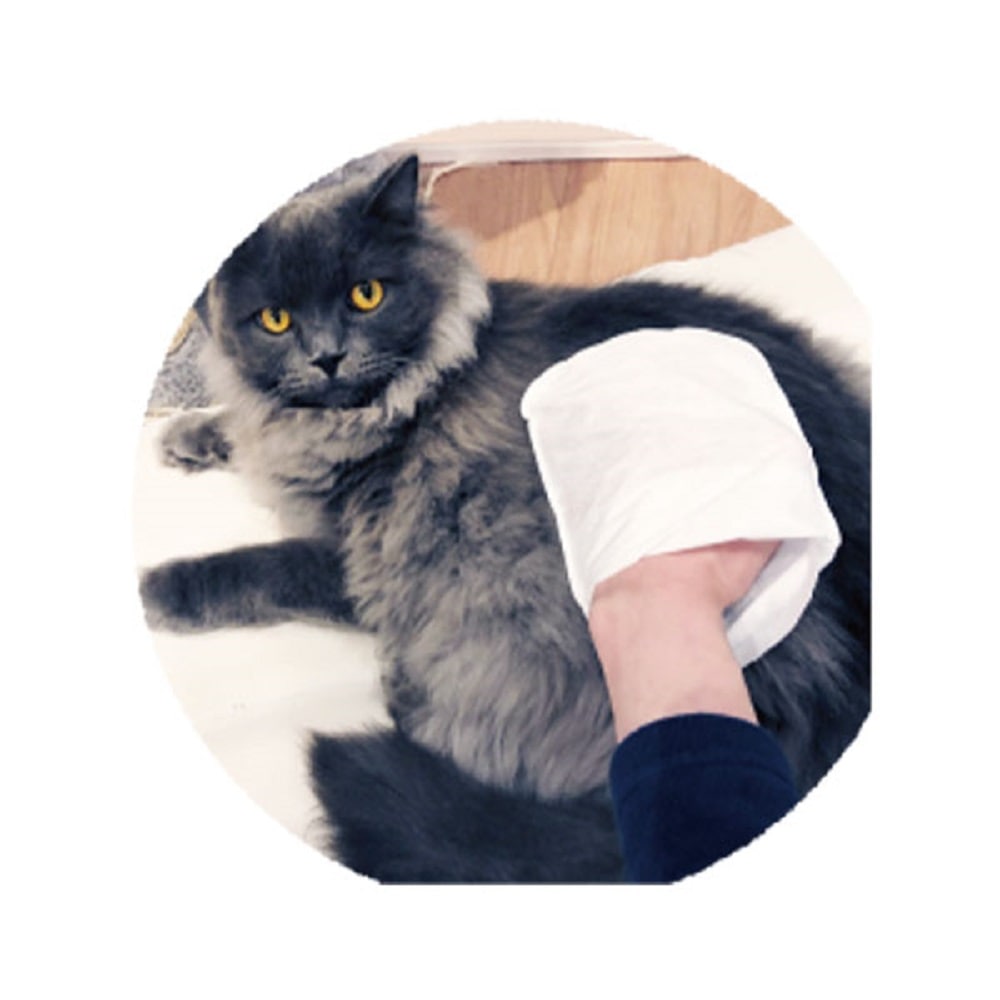 商品の利用(調理)方法:1.袋を開封し、ミトン型シートを端部分より1枚ずつ取り出す。2.手にはめて、気になるペットの汚れをやさしくふきとる。