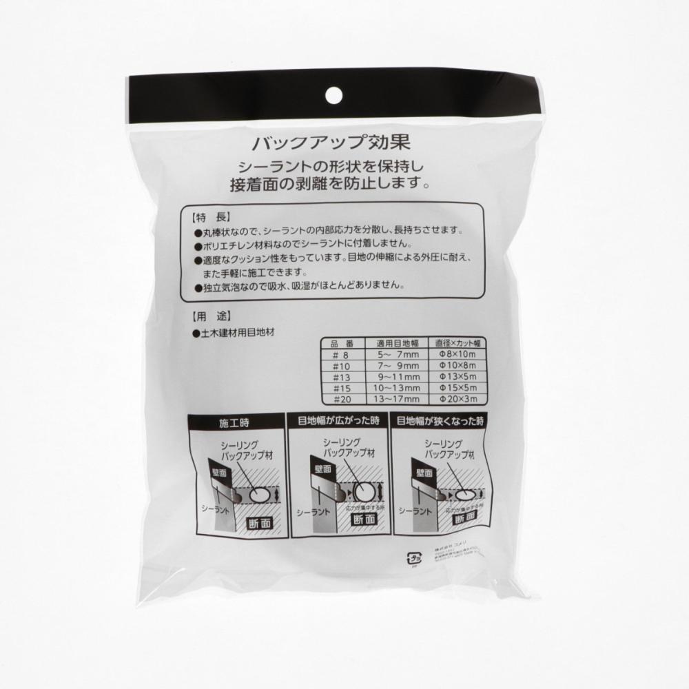 バックアップ効果 シーラントの形状を保持し 接着面の剥離を防止します。 【特長】 ●丸棒状なので、シーラントの内部応力を分散し、長持ちさせます。 ●ポリエチレン材料なのでシーラントに付着しません。 ●適度なクッション性をもっています。 目地の伸縮による外圧に耐え、 また手軽に施工できます。 ●独立気泡なので吸水、吸湿がほとんどありません。 【用途】 ●土木建材用目地材