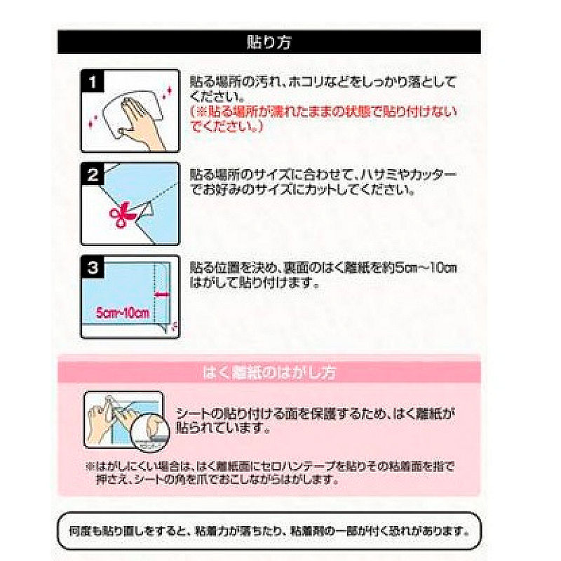 ■材質:(表面)塩化ビニール樹脂100% (中間層)ポリエステル (粘着剤)アクリル系樹脂 (はく離紙)紙 【特徴】 ■貼ってはがせる壁紙シートです ■表面をこすって自分好みにアレンジする事ができます ■ハサミで簡単にカットできます ■表面防水です 【注意事項】 ■貼れる面 一般的な壁紙など※セロパンテープを貼って、用意にはがれる面にはご使用できません ■貼れない面 撥水コートや汚れ防止など特殊な処理をした壁紙、浴室、屋外、土壁、コンクリート ■その他注意事項は別紙ご確認お願いします
