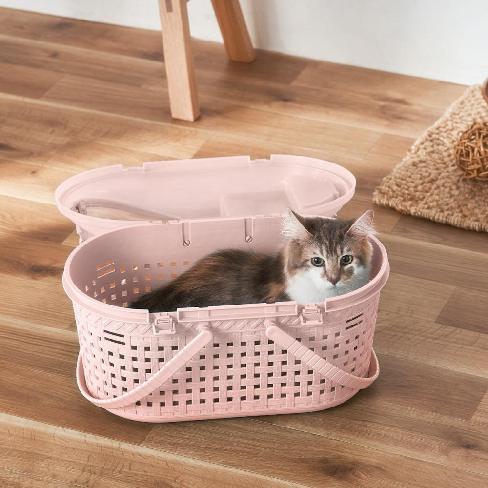 ●素材:本体・フタ・ハンドル・ボタン・ショルダーベルト…ポリプロピレン、バックル…ABS樹脂、窓…スチロール樹脂 ●適合種サイズ(目安):小型犬、猫、小動物など ●製品内寸(約):395×205×255mm ●扉間口サイズ(約):フタ…430×240mm、小窓…175×155mm ●耐荷重(約):体重8kg未満