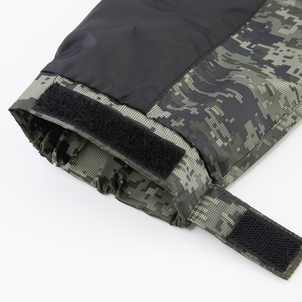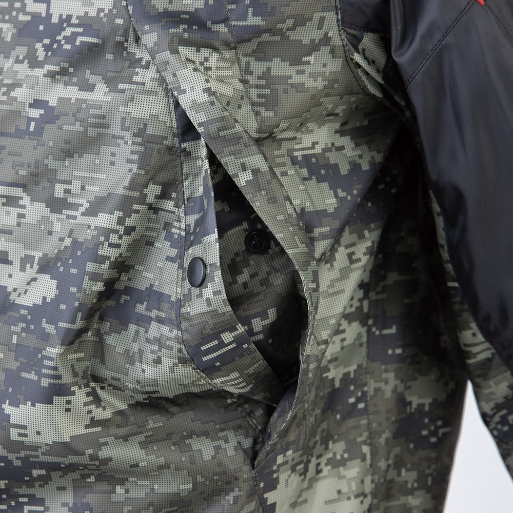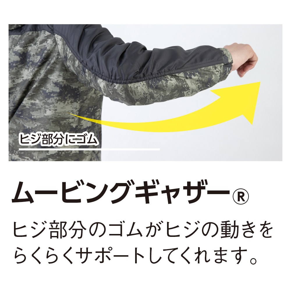 ●生地デジ柄プリント ●アウトドアテイストの両脇アクティブポケット ●肘の動きをサポートする袖ムービングギャザー ●フード、ウエストコード付 ●収納力のある左袖マルチポケット ●夜間での視認性を高める反射素材付き(フード部分) ●袖口アジャスター