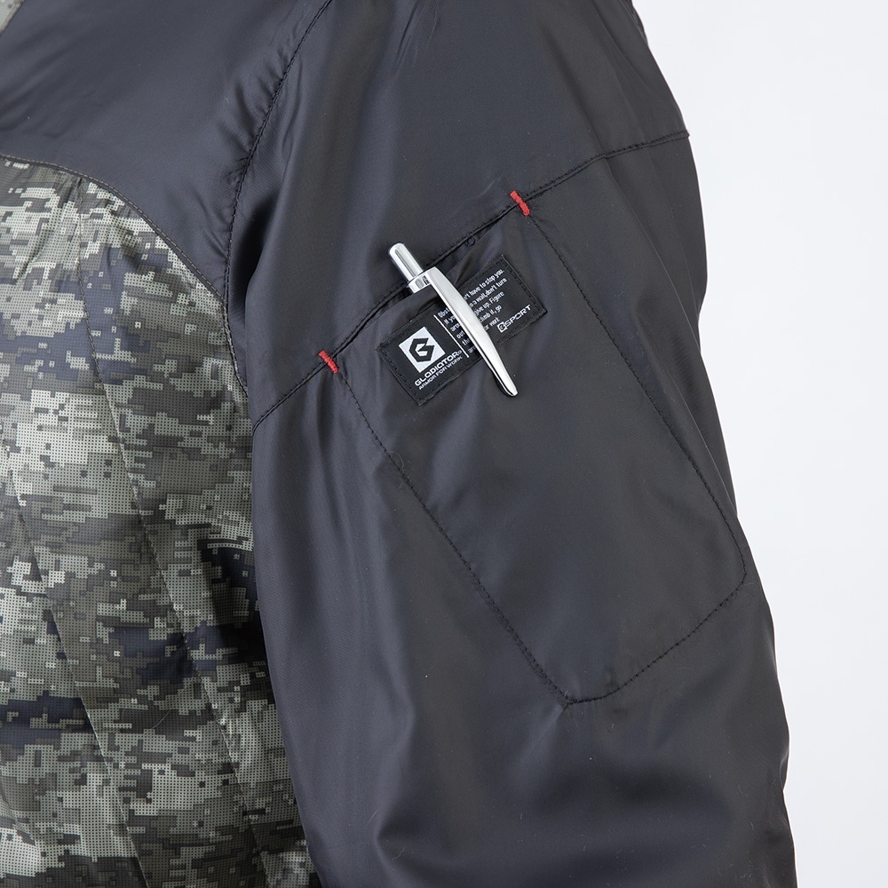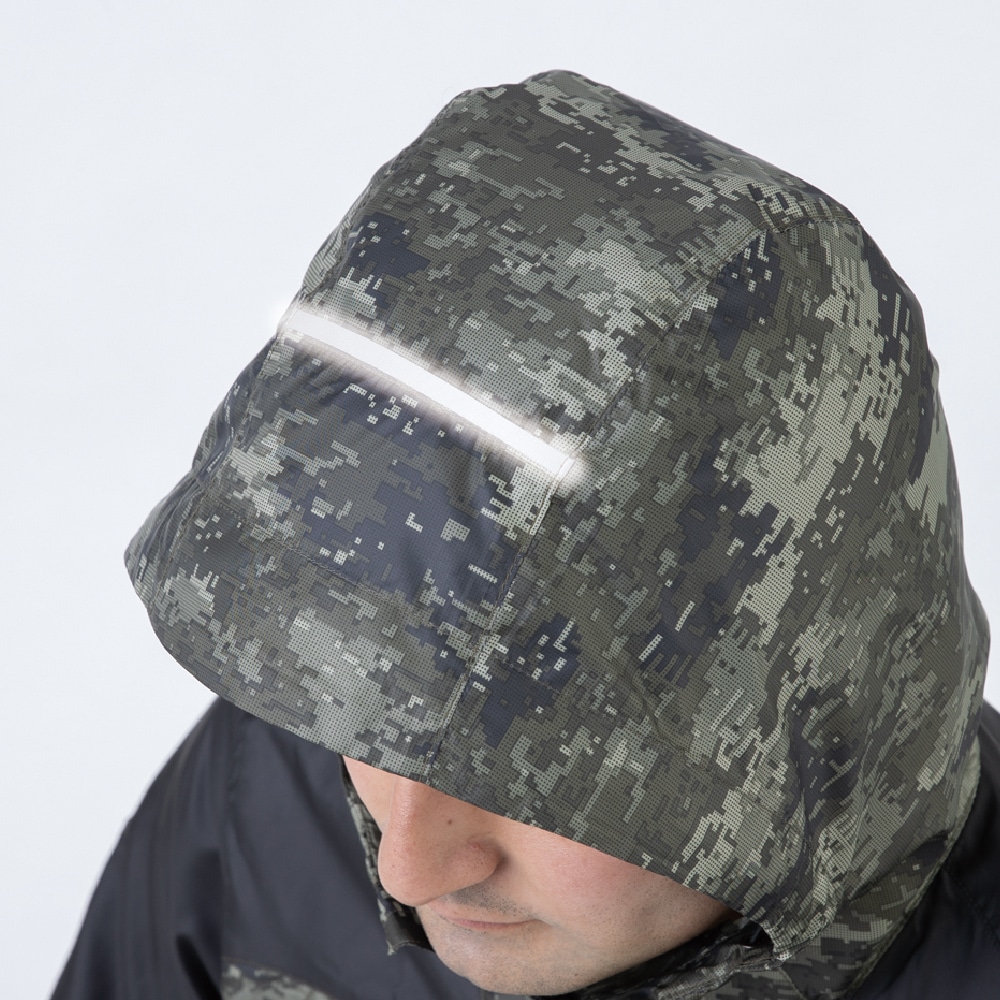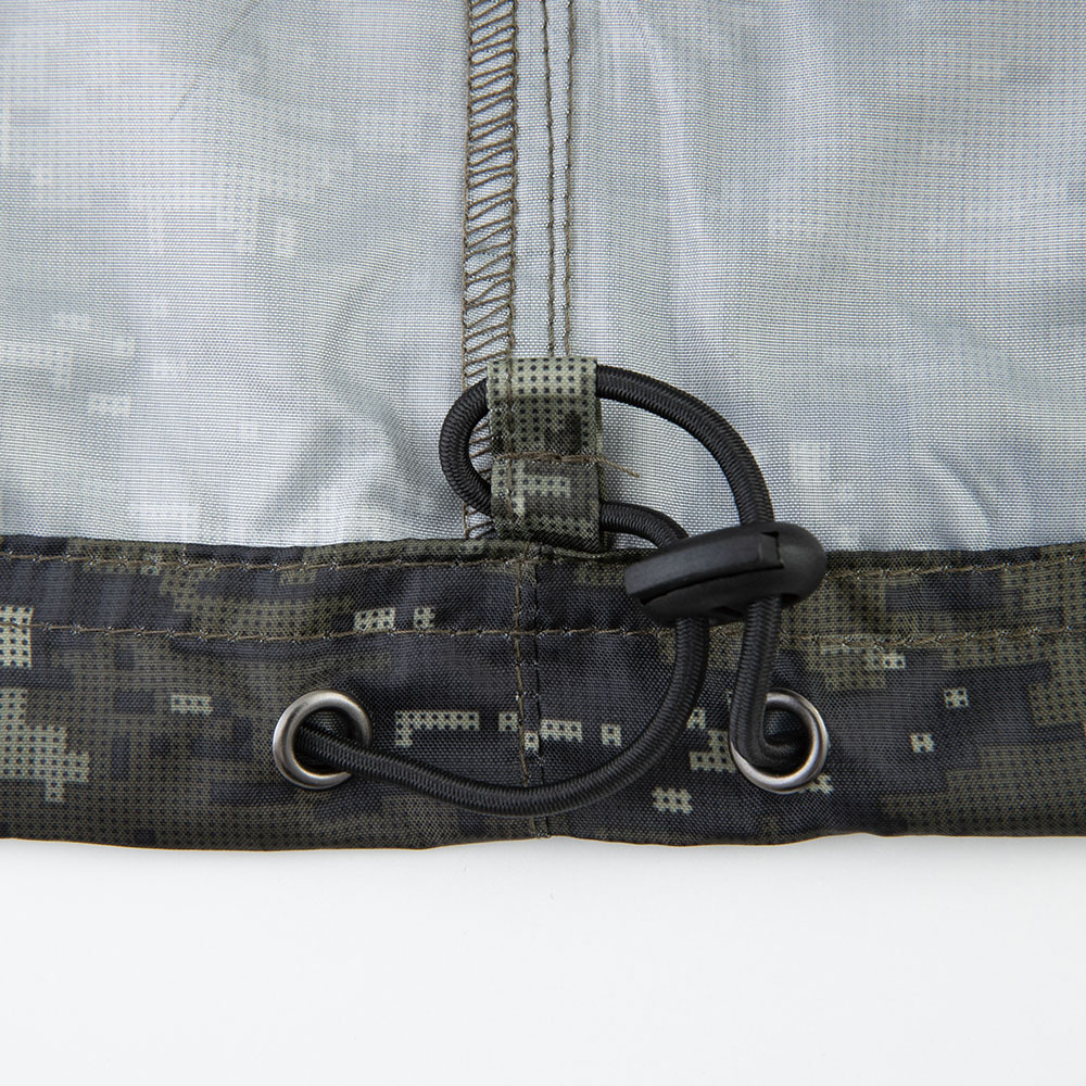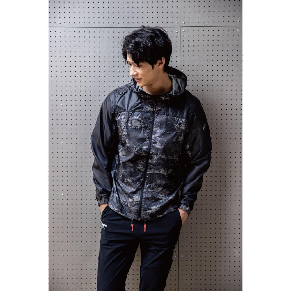 ●生地デジ柄プリント ●アウトドアテイストの両脇アクティブポケット ●肘の動きをサポートする袖ムービングギャザー ●フード、ウエストコード付 ●収納力のある左袖マルチポケット ●夜間での視認性を高める反射素材付き(フード部分) ●袖口アジャスター