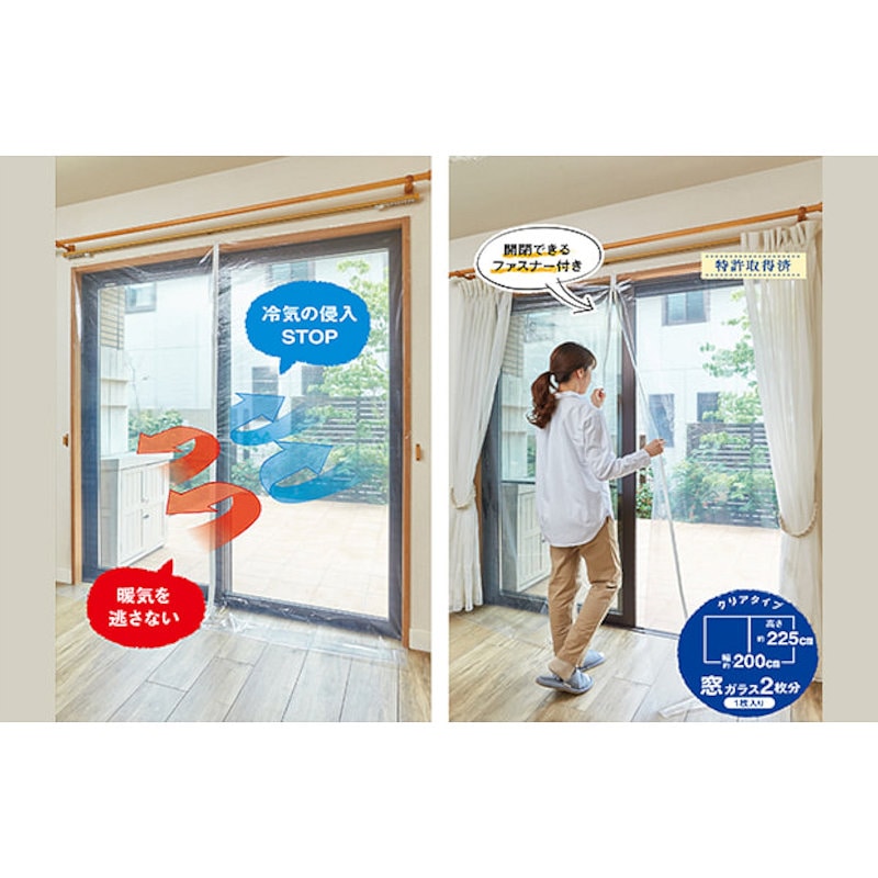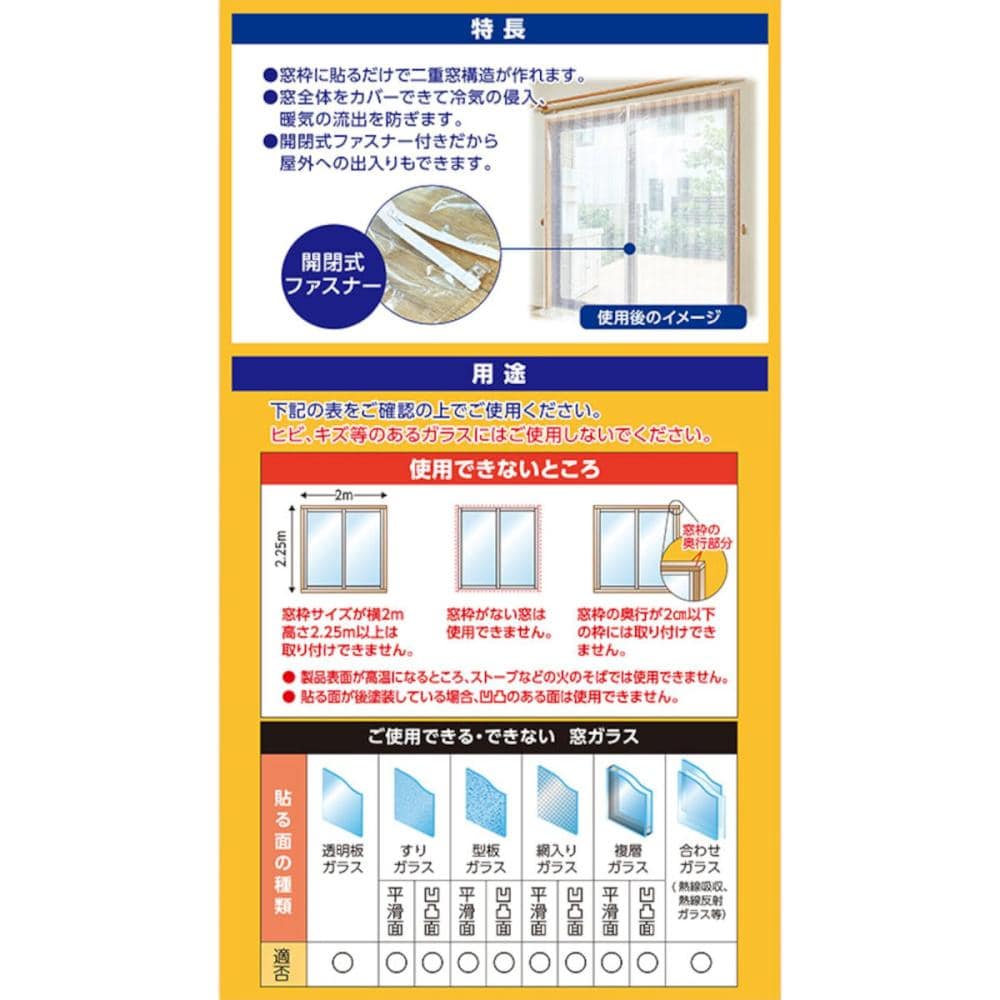 ・ 窓全体をカバーできて冷気の侵入、暖気の流出を防ぎます。 ・ 網入ガラス、複層ガラス等の幅広い窓ガラスに使用できます。 ・ 開閉式ファスナー付きだから屋外への出入りもできます。 ・ 衣類用ファスナー使用。 ・ハサミで 好きなサイズにカットできます。 ・保温効果率 約18%アップ