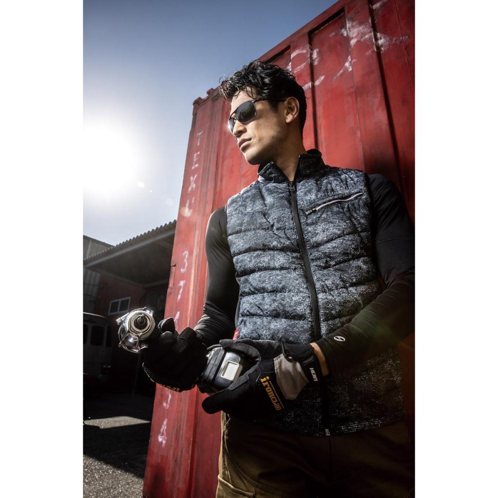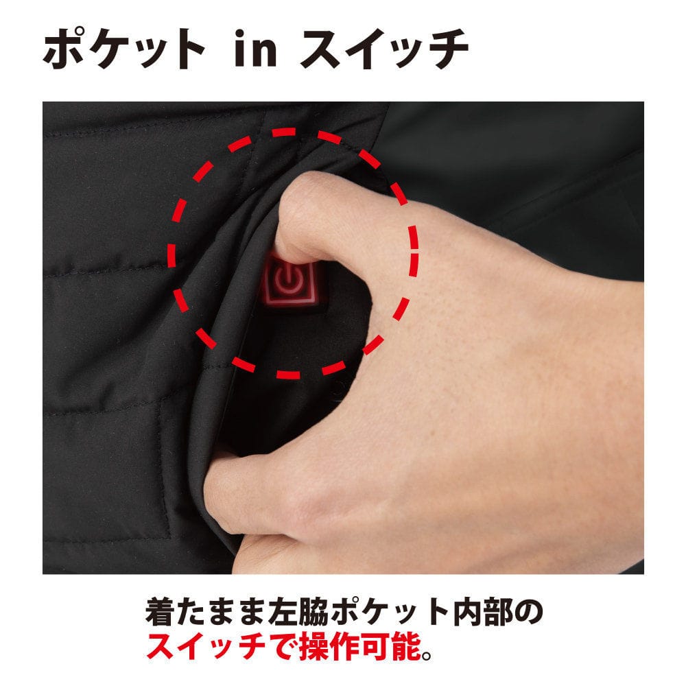 【特長】 ベスト 衿裏ブロックフリース 電熱シート(背中上部、両脇ポケットの計3ヶ所) 左脇ポケット電源ボタン 左脇バッテリーマルチポケット 保温効果の高い背裏アルミプリント 脇防風ストレッチ素材 袖ぐりストレッチテープ 便利な左胸ファスナーポケット
