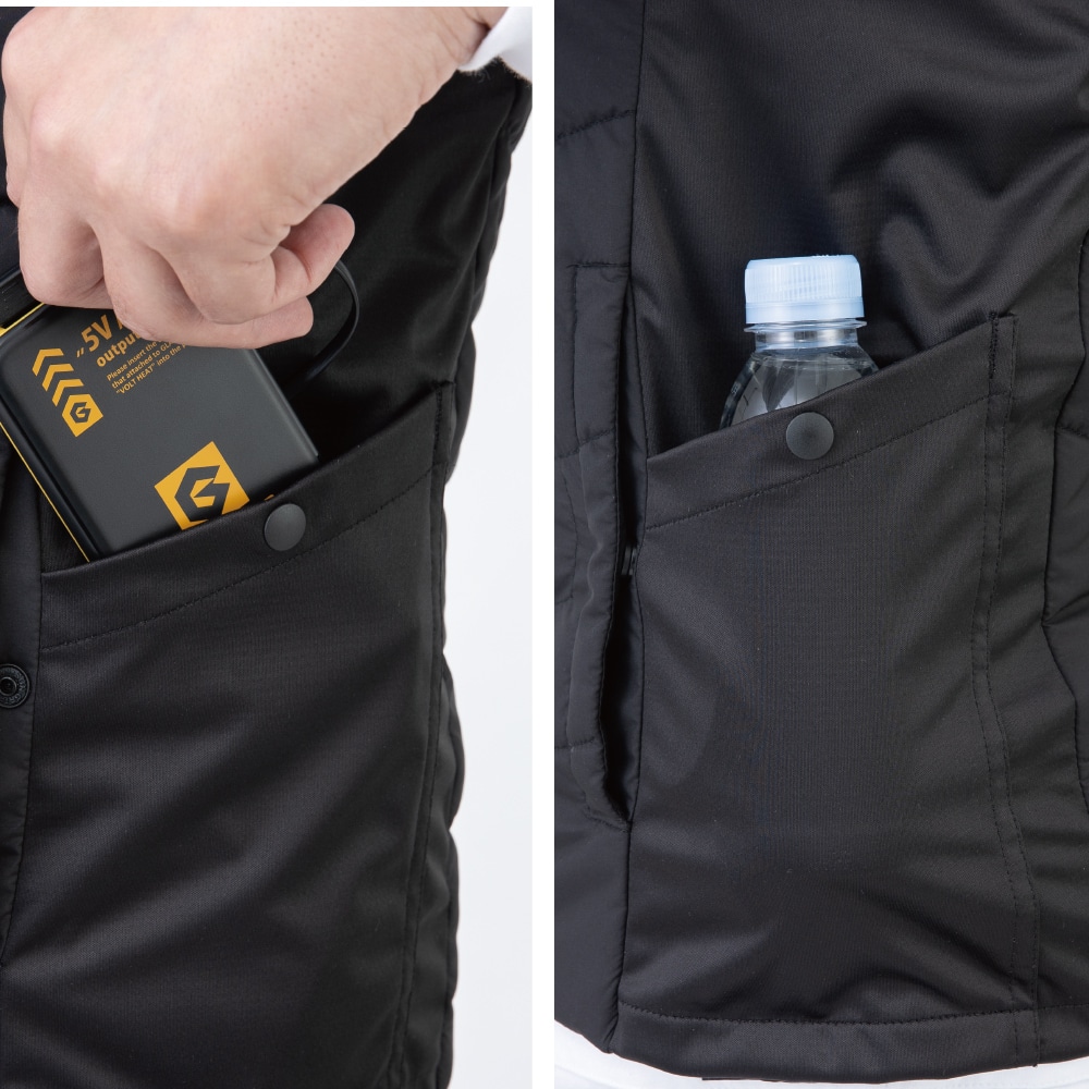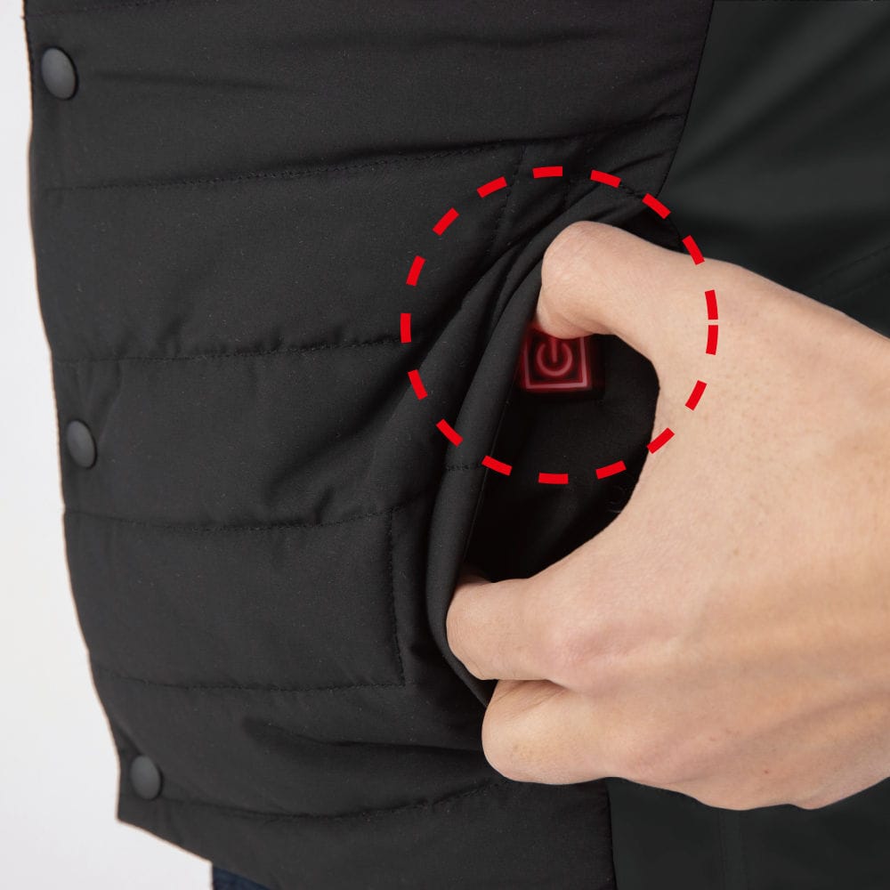 ●背中上部と脇ポケットの計3か所にある電熱シートが背中やお腹、ポケットの中で手も温めることができます。