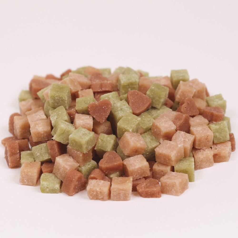 原材料・成分:肉類(鶏ササミ、鶏肉、牛肉)、穀類(小麦粉、グルテン)、脱脂大豆、でん粉類、糖類(オリゴ糖を含む)、油脂類、チーズ、ゼラチン、野菜類(ほうれん草、さつまいも、にんじん)、食物繊維(ポリデキストロース)、魚軟骨抽出物(コンドロイチン含有)、乳酸菌、グリセリン、ミネラル類(カルシウム、リン、カリウム、ナトリウム、塩素、マグネシウム、鉄、銅、マンガン、亜鉛、ヨウ素、セレン)、pH調整剤、ソルビトール、ビタミン類(A、B1、B2、B6、B12、C、D、E、パントテン酸、ナイアシン、葉酸、コリン)、増粘多糖類、膨張剤、リン酸塩(Na)、着色料(コチニール、クチナシ、ベニバナ)、グルコサミン