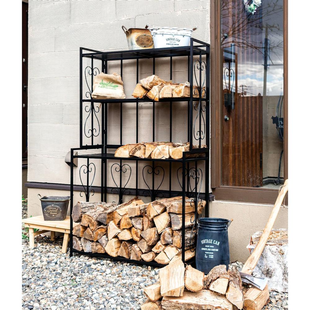 ブラック色のアイアン製で丈夫なログラック。上部には焚き付けなど、種類ごとに分けて収納し、効率よく薪を保管することが可能です。