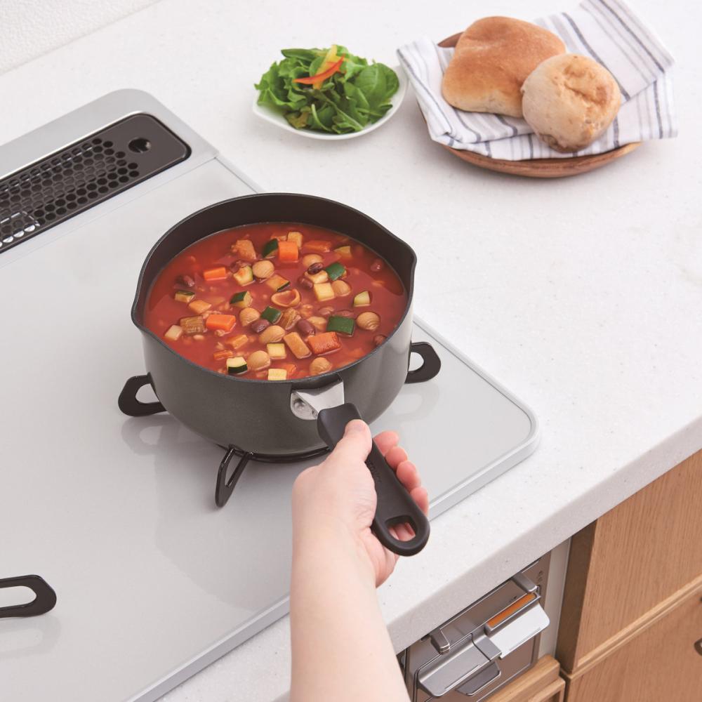 ■菜箸などのキッチンツールを置くことができるハンドル形状。