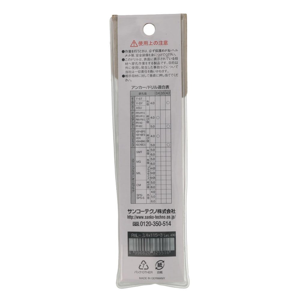 ●被削材:コンクリート、ブロック、モルタル、デッキプレート(貫通)+コンクリート ●刃先径: 3.4mm ●有効長: 50mm ●全長:115mm ●シャンク: SDSplus ●適合機種: 軽量ハンマードリル
