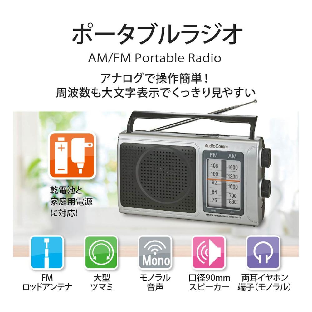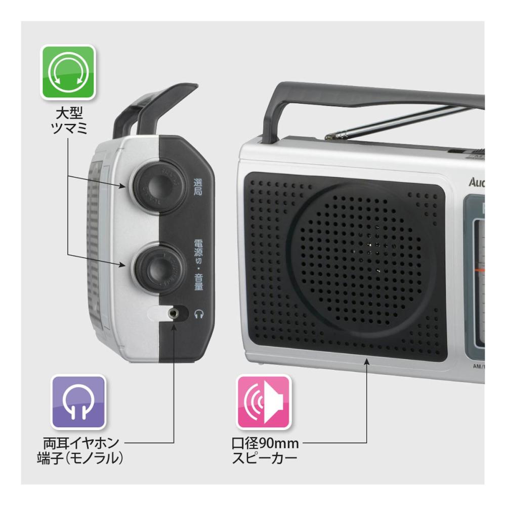 ・ 持ち運びに便利な折りたたみ式キャリーハンドル ・ 乾電池と家庭用電源に対応 ・ FMロッドアンテナ付き ・ 大型ツマミ ・ モノラル音声 ・ 口径90mmスピーカー ・ 両耳イヤホン端子(モノラル) ・ ワイドFM(FM補完放送)対応